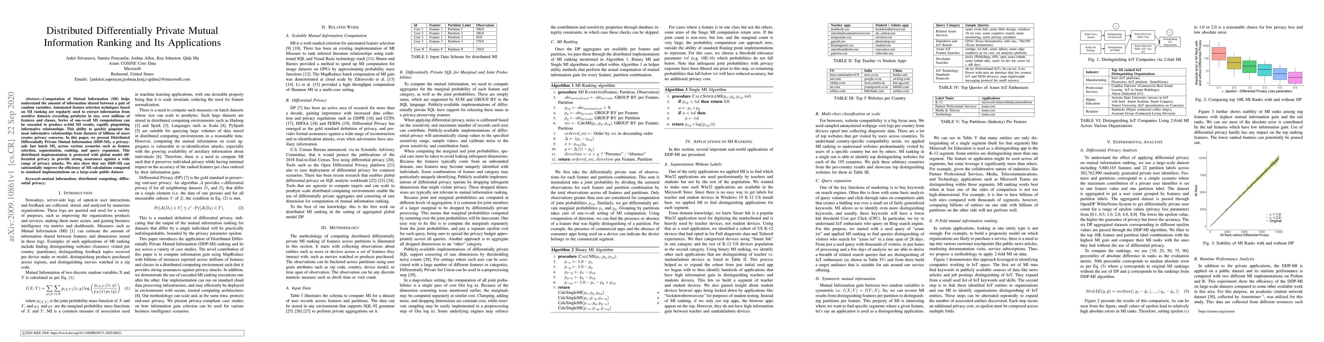 Computation of Mutual Information (MI) helps understand the amount of information shared between a pair of random variables. Automated feature selection techniques based on MI ranking are regularly used to extract information from sensitive datasets exceeding petabytes in size, over millions of features and classes. Series of one-vs-all MI computations can be cascaded to produce n-fold MI results, rapidly pinpointing informative relationships. This ability to quickly pinpoint the most informative relationships from datasets of billions of users creates privacy concerns. In this paper, we present Distributed Differentially Private Mutual Information (DDP-MI), a privacy-safe fast batch MI, across various scenarios such as feature selection, segmentation, ranking, and query expansion. This distributed implementation is protected with global model differential privacy to provide strong assurances against a wide range of privacy attacks. We also show that our DDP-MI can substantially improve the efficiency of MI calculations compared to standard implementations on a large-scale public dataset.