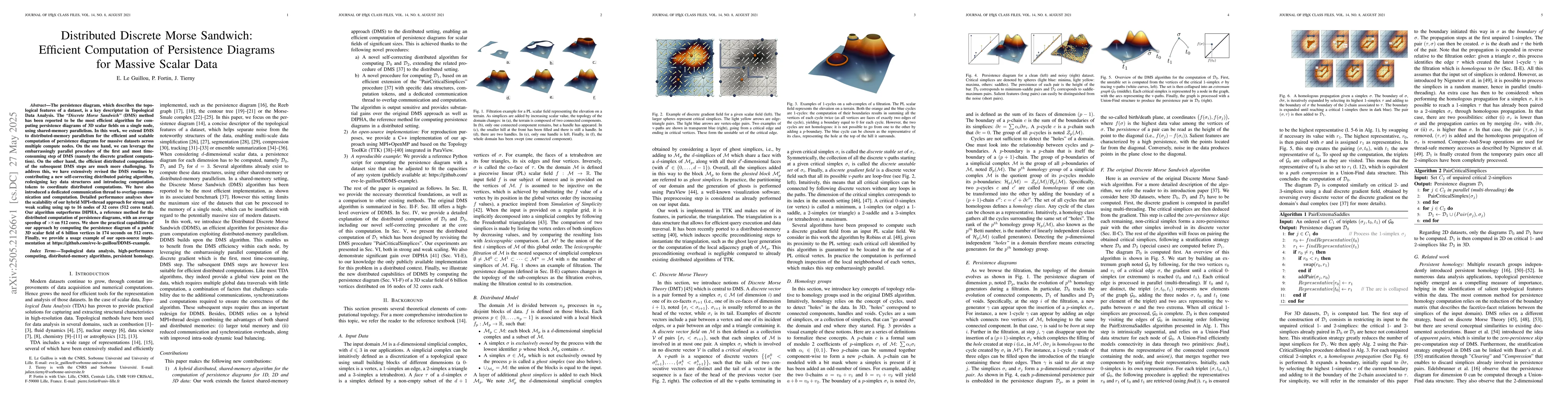 The research extends the Discrete Morse Sandwich (DMS) method for computing persistence diagrams from single-node shared-memory parallelism to distributed-memory parallelism, employing MPI and thread-based hybrid approach with revised DMS routines, a self-correcting distributed pairing algorithm, redesigned data structures, computation tokens, and a dedicated communication thread.