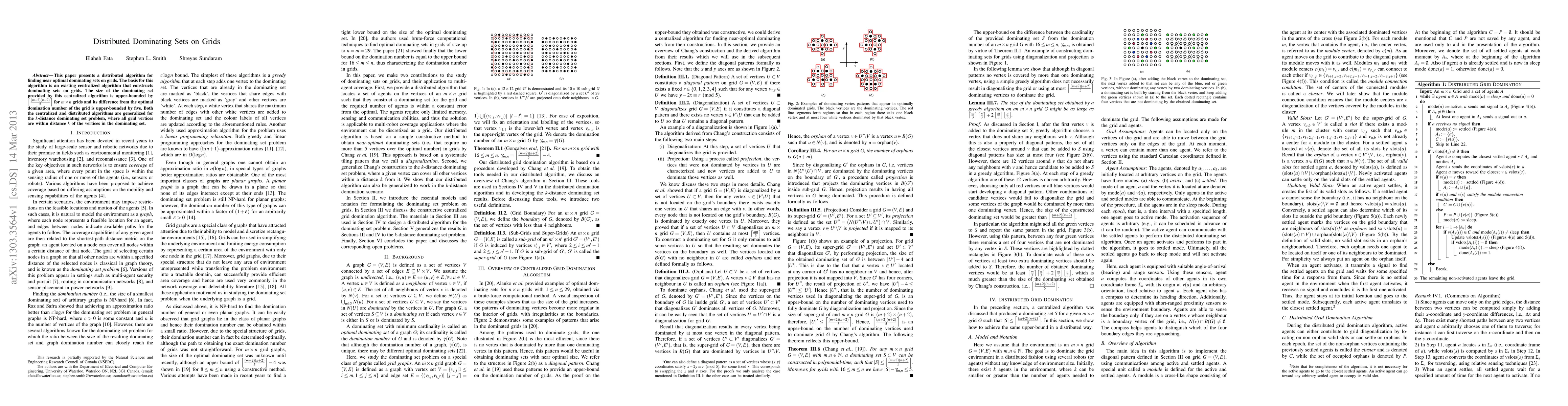 This paper presents a distributed algorithm for finding near optimal dominating sets on grids. The basis for this algorithm is an existing centralized algorithm that constructs dominating sets on grids. The size of the dominating set provided by this centralized algorithm is upper-bounded by $\lceil\frac{(m+2)(n+2)}{5}\rceil$ for $m\times n$ grids and its difference from the optimal domination number of the grid is upper-bounded by five. Both the centralized and distributed algorithms are generalized for the $k$-distance dominating set problem, where all grid vertices are within distance $k$ of the vertices in the dominating set.