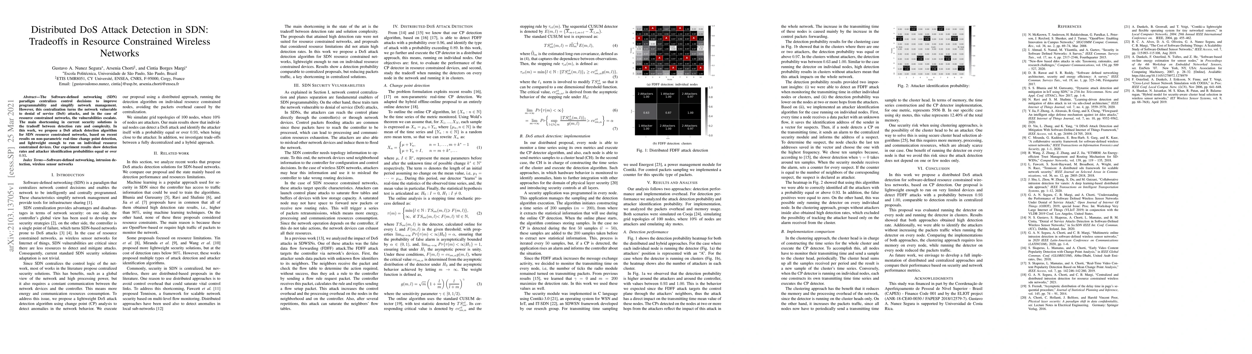 This paper proposes a lightweight DoS attack detection algorithm for Software-Defined Networking (SDN) in resource-constrained wireless networks, balancing detection accuracy with computational efficiency. Experimental results demonstrate detection rates and attacker identification probabilities exceeding 0.93.
