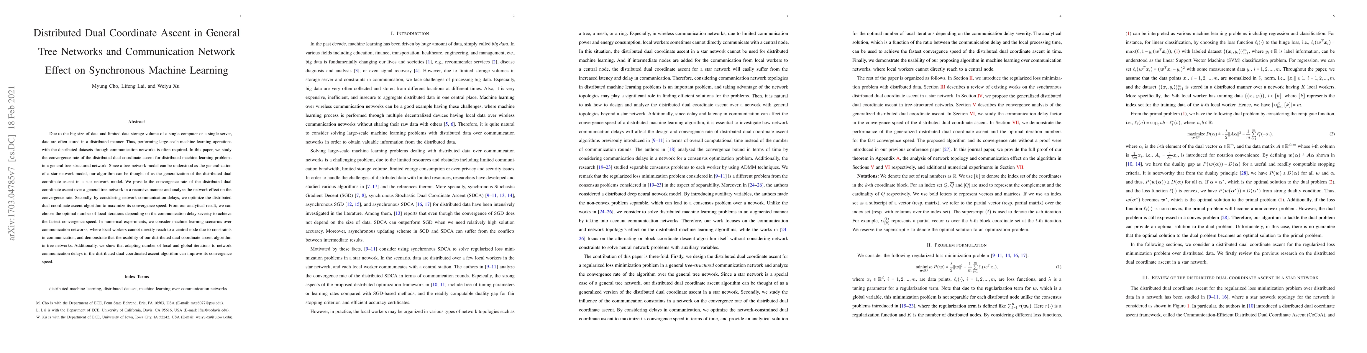 This paper investigates the convergence rate of distributed dual coordinate ascent in general tree-structured networks for machine learning, providing a recursive convergence rate analysis. It optimizes the algorithm to maximize speed by adapting the number of local iterations based on communication delays, demonstrating improved convergence in scenarios with network constraints.
