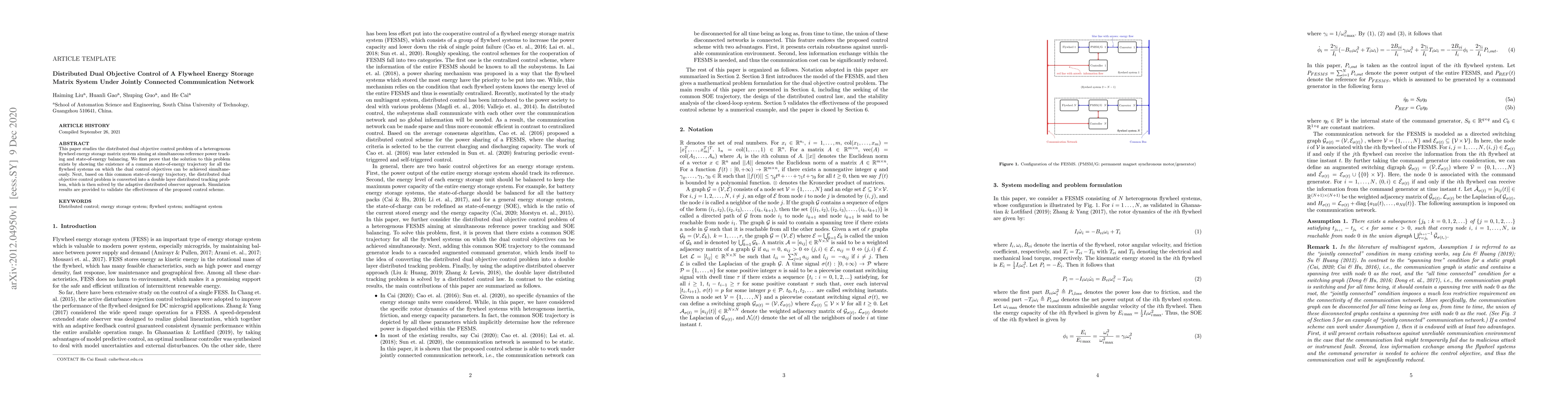 This paper studies the distributed dual objective control problem of a heterogenous flywheel energy storage matrix system aiming at simultaneous reference power track-ing and state-of-energy balancing. We first prove that the solution to this problem exists by showing the existence of a common state-of-energy trajectory for all the flywheel systems on which the dual control objectives can be achieved simultaneously. Next, based on this common state-of-energy trajectory, the distributed dual objective control problem is converted into a double layer distributed tracking problem, which is then solved by the adaptive distributed observer approach. Simulation results are provided to validate the effectiveness of the proposed control scheme.