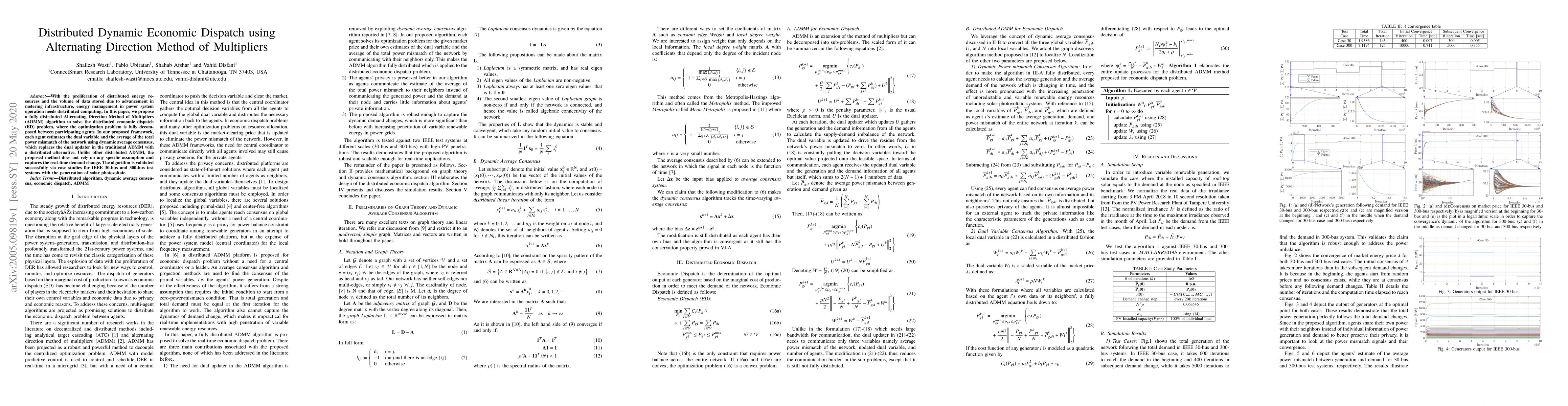 This paper proposes a fully distributed Alternating Direction Method of Multipliers (ADMM) algorithm for solving the distributed economic dispatch problem, leveraging dynamic average consensus to replace the traditional dual updater. The method is validated on IEEE 30-bus and 300-bus systems, demonstrating its effectiveness in handling real-time demand changes and solar photovoltaic penetration.
