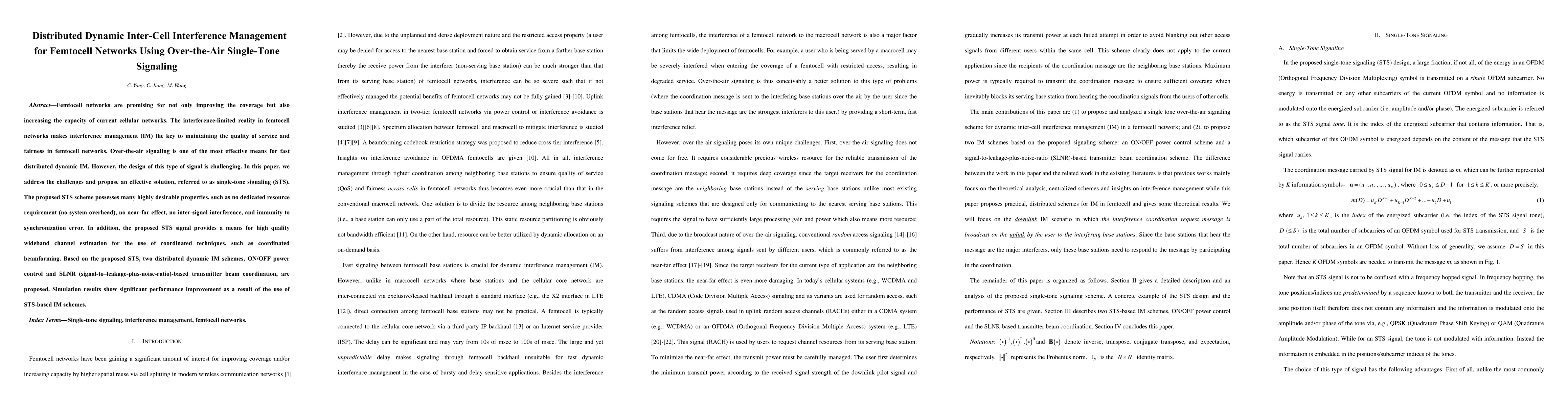 This paper proposes a single-tone signaling (STS) scheme for distributed dynamic interference management in femtocell networks, offering benefits such as no system overhead and immunity to synchronization errors. The STS-based interference management schemes, including ON/OFF power control and SLNR-based beam coordination, demonstrate significant performance improvements in simulations.