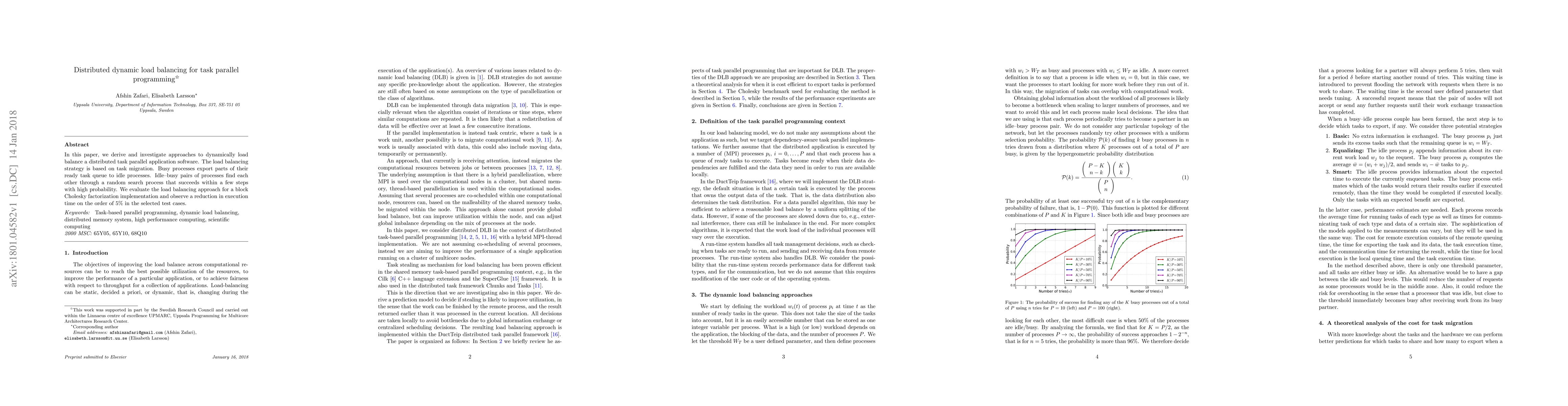 In this paper, we derive and investigate approaches to dynamically load balance a distributed task parallel application software. The load balancing strategy is based on task migration. Busy processes export parts of their ready task queue to idle processes. Idle--busy pairs of processes find each other through a random search process that succeeds within a few steps with high probability. We evaluate the load balancing approach for a block Cholesky factorization implementation and observe a reduction in execution time on the order of 5\% in the selected test cases.