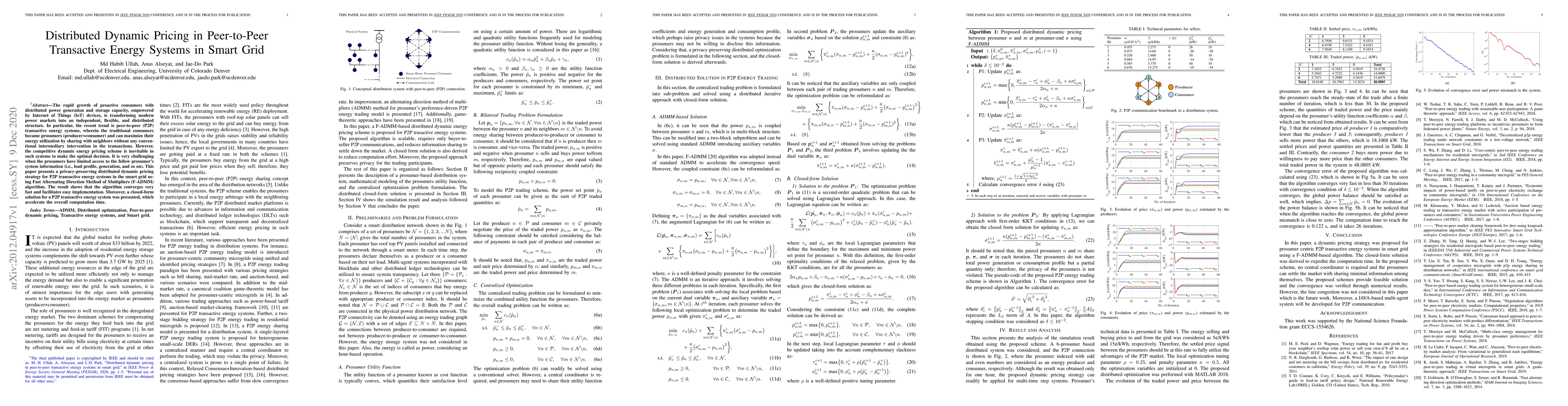 The rapid growth of proactive consumers with distributed power generation and storage capacity, empowered by Internet of Things (IoT) devices, is transforming modern power markets into an independent, flexible, and distributed structure. In particular, the recent trend is peer-to-peer (P2P) transactive energy systems, wherein the traditional consumers became prosumers (producer+consumer) and can maximize their energy utilization by sharing with neighbors without any conventional intermediary intervention in the transactions. However, the competitive dynamic energy pricing scheme is inevitable in such systems to make the optimal decision. It is very challenging when the prosumers have limited access to the fellow prosumer's system information (i.e., load profile, generation, and so on). This paper presents a privacy-preserving distributed dynamic pricing strategy for P2P transactive energy systems in the smart grid using Fast Alternating Direction Method of Multipliers (F-ADMM) algorithm. The result shows that the algorithm converges very fast and facilitates easy implementation. Moreover, a closed-form solution for a P2P transactive energy system was presented, which accelerate the overall computation time.