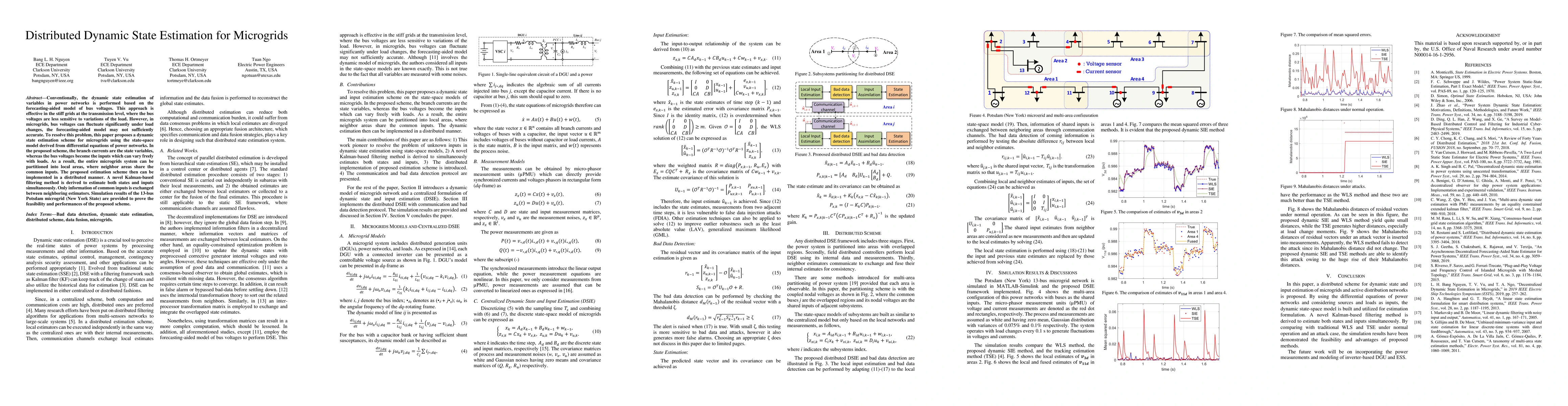 Conventionally, the dynamic state estimation of variables in power networks is performed based on the forecasting-aided model of bus voltages. This approach is effective in the stiff grids at the transmission level, where the bus voltages are less sensitive to variations of the load. However, in microgrids, bus voltages can fluctuate significantly under load changes, the forecasting-aided model may not sufficiently accurate. To resolve this problem, this paper proposes a dynamic state estimation scheme for microgrids using the state-space model derived from differential equations of power networks. In the proposed scheme, the branch currents are the state variables, whereas the bus voltages become the inputs which can vary freely with loads. As a result, the entire microgrids system can be partitioned into local areas, where neighbor areas share the common inputs. The proposed estimation scheme then can be implemented in a distributed manner. A novel Kalman-based filtering method is derived to estimate both states and inputs simultaneously. Only information of common inputs is exchanged between neighboring estimators. Simulation results of the 13-bus Potsdam microgrid (New York State) are provided to prove the feasibility and performances of the proposed scheme.