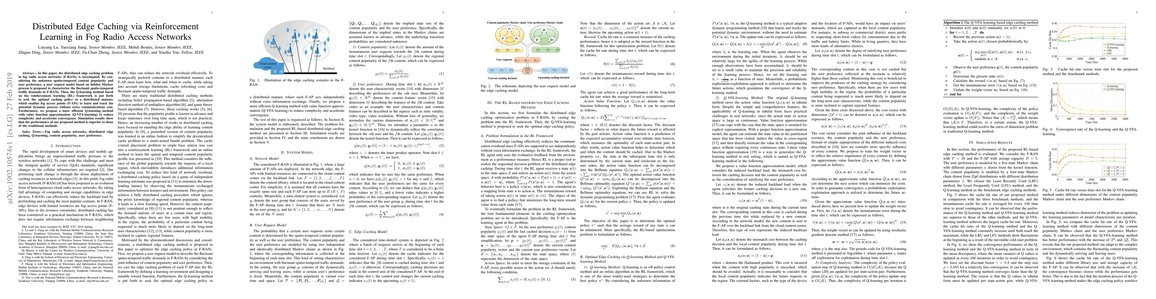 This paper proposes a reinforcement learning-based approach for distributed edge caching in fog radio access networks, using Q-learning to optimize caching policies. A Q-VFA-learning method is introduced to improve efficiency and convergence, demonstrating superior performance over traditional methods in simulations.