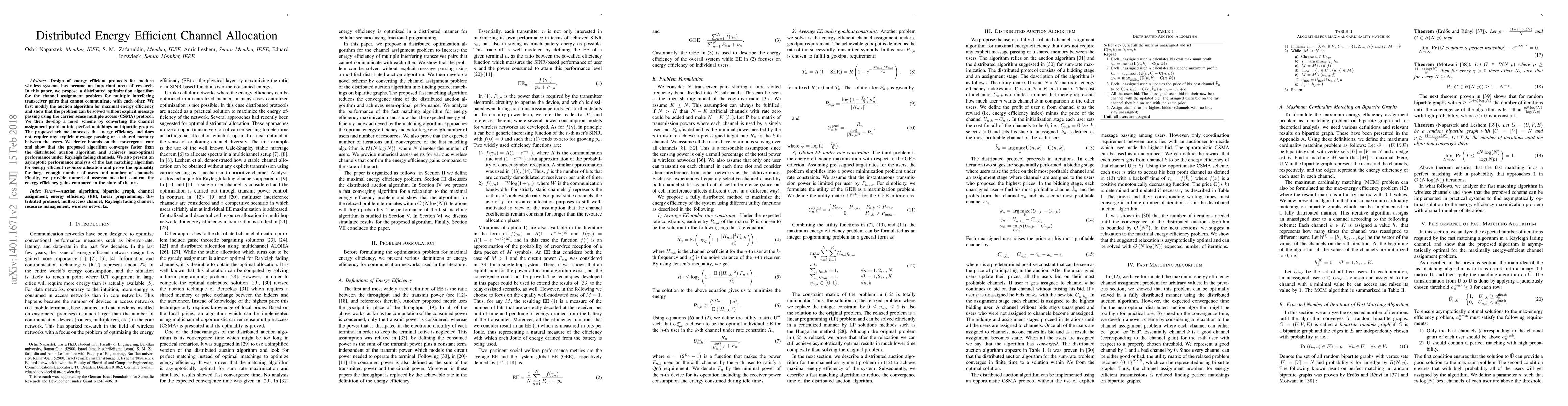 Design of energy efficient protocols for modern wireless systems has become an important area of research. In this paper, we propose a distributed optimization algorithm for the channel assignment problem for multiple interfering transceiver pairs that cannot communicate with each other. We first modify the auction algorithm for maximal energy efficiency and show that the problem can be solved without explicit message passing using the carrier sense multiple access (CSMA) protocols. We then develop a novel scheme by converting the channel assignment problem into perfect matchings on bipartite graphs. The proposed scheme improves the energy efficiency and does not require any explicit message passing or a shared memory between the users. We derive bounds on the convergence rate and show that the proposed algorithm converges faster than the distributed auction algorithm and achieves near-optimal performance under Rayleigh fading channels. We also present an asymptotic performance analysis of the fast matching algorithm for energy efficient resource allocation and prove the optimality for large enough number of users and number of channels. Finally, we provide numerical assessments that confirm the energy efficiency gains compared to the state of the art.