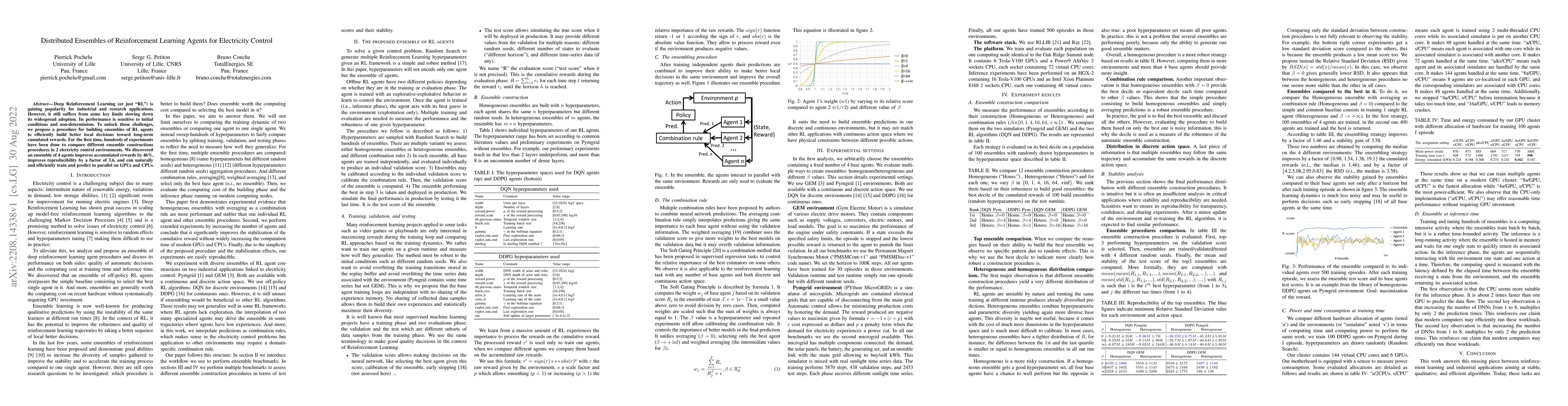 Deep Reinforcement Learning (or just "RL") is gaining popularity for industrial and research applications. However, it still suffers from some key limits slowing down its widespread adoption. Its performance is sensitive to initial conditions and non-determinism. To unlock those challenges, we propose a procedure for building ensembles of RL agents to efficiently build better local decisions toward long-term cumulated rewards. For the first time, hundreds of experiments have been done to compare different ensemble constructions procedures in 2 electricity control environments. We discovered an ensemble of 4 agents improves accumulated rewards by 46%, improves reproducibility by a factor of 3.6, and can naturally and efficiently train and predict in parallel on GPUs and CPUs.