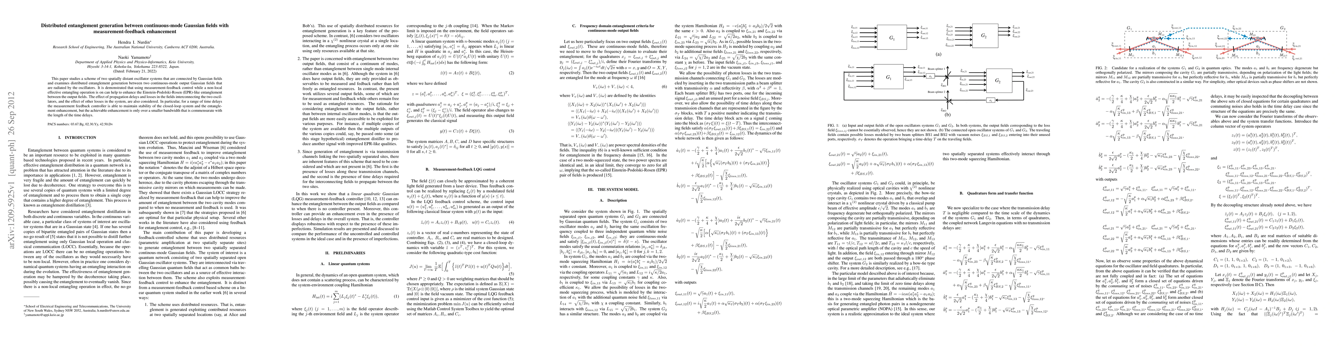 This paper studies a scheme of two spatially distant oscillator systems that are connected by Gaussian fields and examines distributed entanglement generation between two continuous-mode output Gaussian fields that are radiated by the oscillators. It is demonstrated that using measurement-feedback control while a non-local effective entangling operation is on can help to enhance the Einstein-Podolski-Rosen (EPR)-like entanglement between the output fields. The effect of propagation delays and losses in the fields interconnecting the two oscillators, and the effect of other losses in the system, are also considered. In particular, for a range of time delays the measurement feedback controller is able to maintain stability of the closed-loop system and the entanglement enhancement, but the achievable enhancement is only over a smaller bandwidth that is commensurate with the length of the time delays.