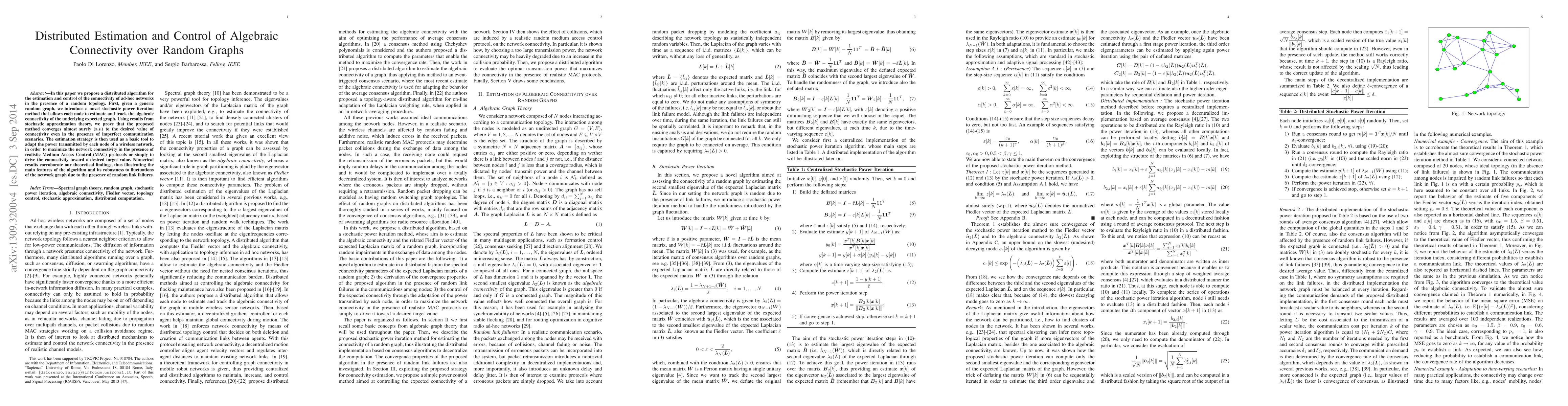 This paper presents a distributed algorithm for estimating and controlling network connectivity in random topologies. It introduces a stochastic power iteration method for nodes to track the expected graph's connectivity, proving almost sure convergence. The method also adapts node power transmission to maximize connectivity or reach a target value, with numerical results validating its robustness to random link failures.