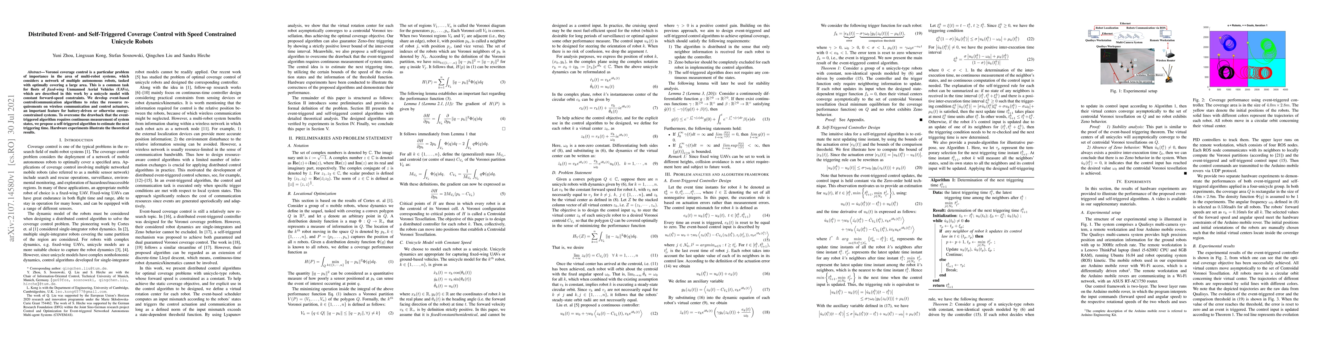This paper presents an event- and self-triggered coverage control algorithm for unicycle robots with speed constraints, aiming to optimize area coverage in multi-robot systems. The proposed method reduces communication and control resource usage, crucial for energy-efficient operations, and includes hardware experiments to validate the theoretical results.