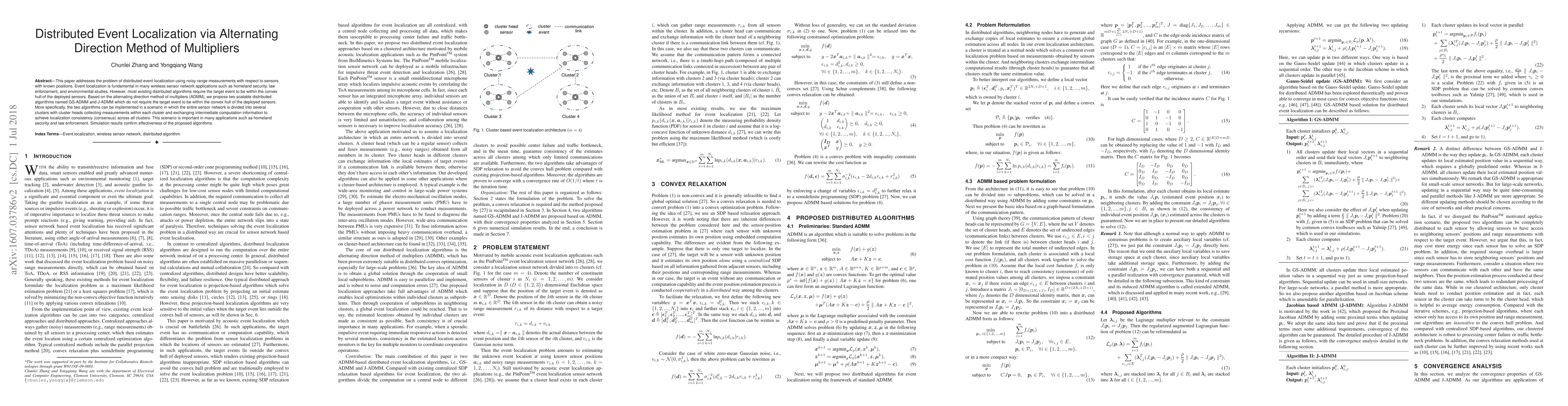 This paper proposes two scalable distributed algorithms, GS-ADMM and J-ADMM, for event localization in wireless sensor networks using noisy range measurements, without requiring the event to be within the convex hull of sensors. The algorithms achieve localization consistency across clusters, enhancing applications in homeland security and law enforcement. Simulation results demonstrate the effectiveness of the proposed methods.