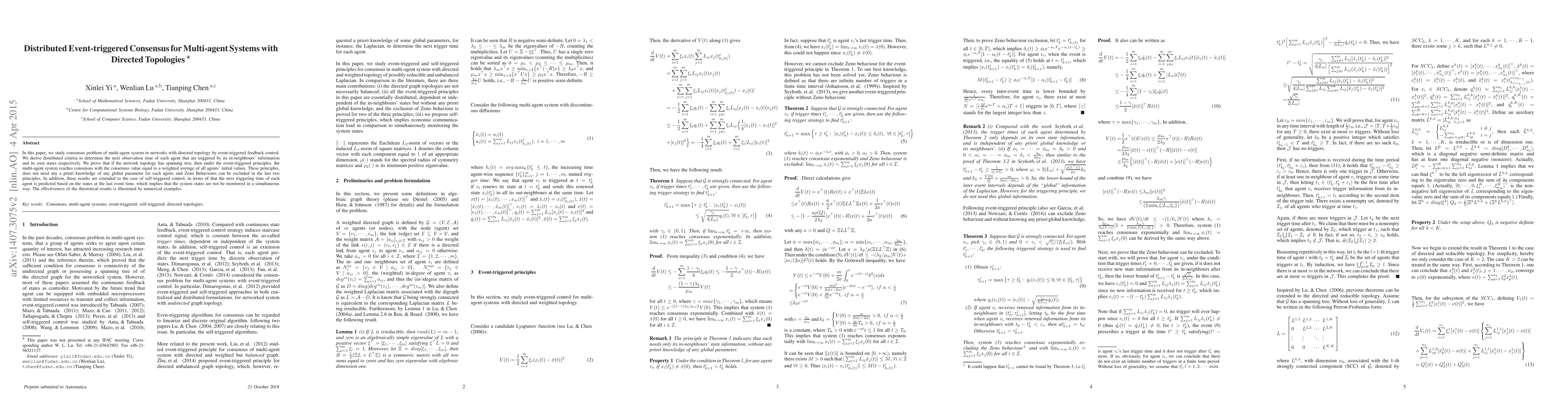 This paper addresses the consensus problem in multi-agent systems with directed topologies using event-triggered feedback control. It derives distributed criteria for triggering observations based on neighbor information and agent states, proving consensus under irreducible network topologies. Results extend to reducible topologies with spanning trees and self-triggered control. Numerical examples validate the theoretical findings.