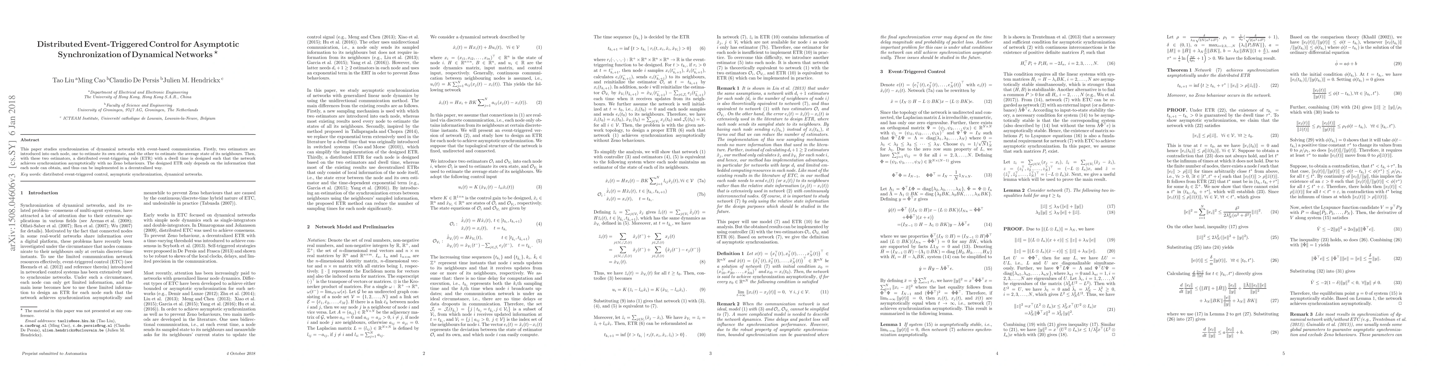 This paper proposes a distributed event-triggered control method for achieving asymptotic synchronization in dynamical networks using event-based communication. The method employs decentralized estimators and an event-triggering rule to avoid Zeno behavior while ensuring synchronization.