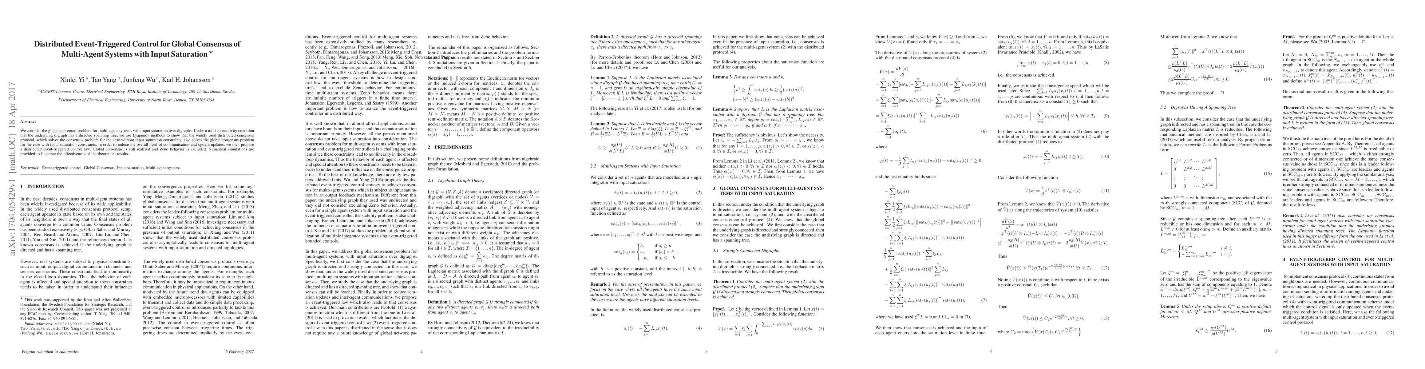 This paper addresses the global consensus problem for multi-agent systems under input saturation constraints using distributed event-triggered control. It demonstrates that a standard consensus protocol can still achieve consensus despite saturation, and proposes an event-triggered strategy to minimize communication and updates while ensuring global consensus and avoiding Zeno behavior.