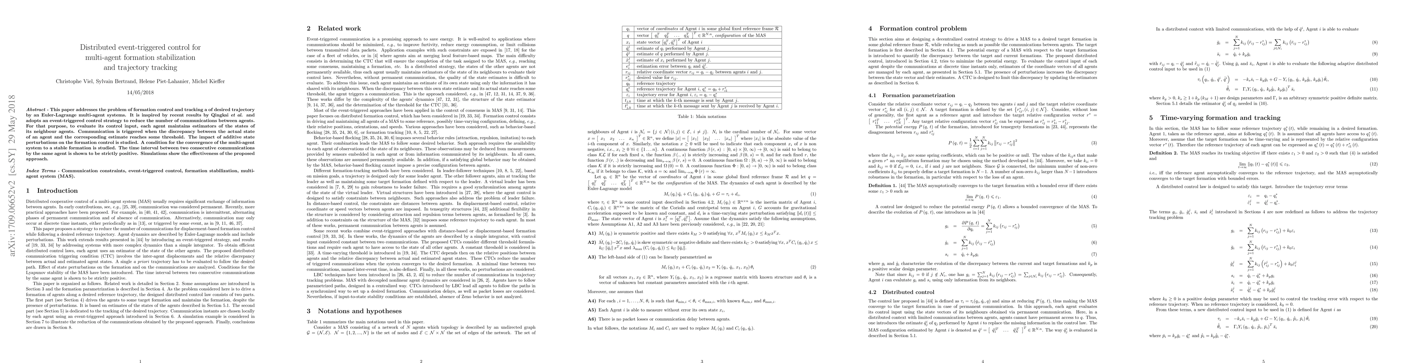 This paper addresses the problem of formation control and tracking a of desired trajectory by an Euler-Lagrange multi-agent systems. It is inspired by recent results by Qingkai et al. and adopts an event-triggered control strategy to reduce the number of communications between agents. For that purpose, to evaluate its control input, each agent maintains estimators of the states of the other agents. Communication is triggered when the discrepancy between the actual state of an agent and the corresponding estimate reaches some threshold. The impact of additive state perturbations on the formation control is studied. A condition for the convergence of the multi-agent system to a stable formation is studied. Simulations show the effectiveness of the proposed approach.