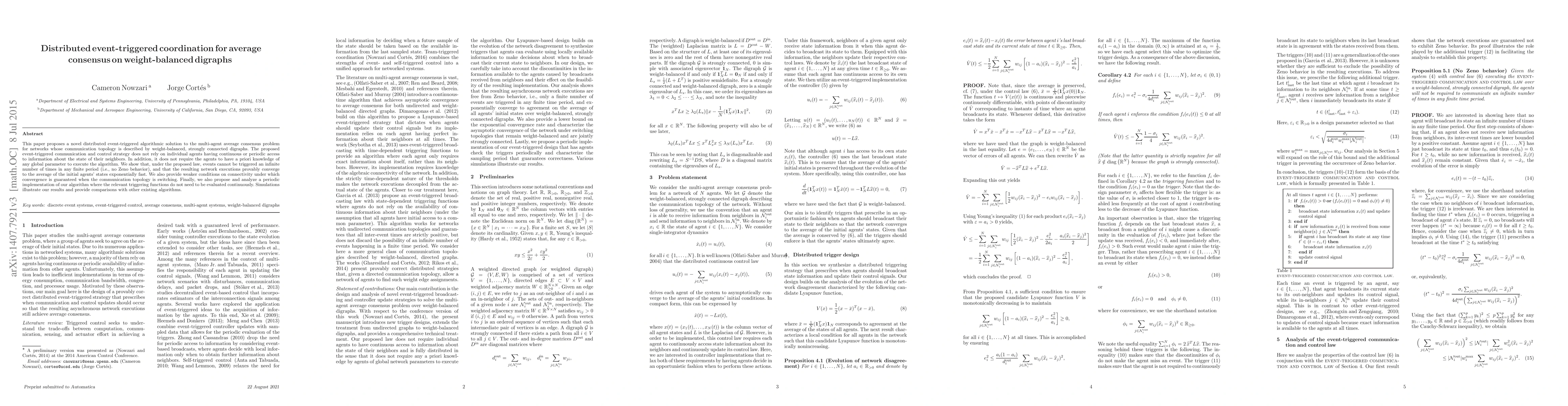 This paper proposes a novel distributed event-triggered algorithmic solution to the multi-agent average consensus problem for networks whose communication topology is described by weight-balanced, strongly connected digraphs. The proposed event-triggered communication and control strategy does not rely on individual agents having continuous or periodic access to information about the state of their neighbors. In addition, it does not require the agents to have a priori knowledge of any global parameter. We show that, under the proposed law, events cannot be triggered an infinite number of times in any finite period (i.e., no Zeno behavior), and that the resulting network executions provably converge to the average of the initial agents' states exponentially fast. We also provide weaker conditions on connectivity under which convergence is guaranteed when the communication topology is switching. Simulations illustrate our results.