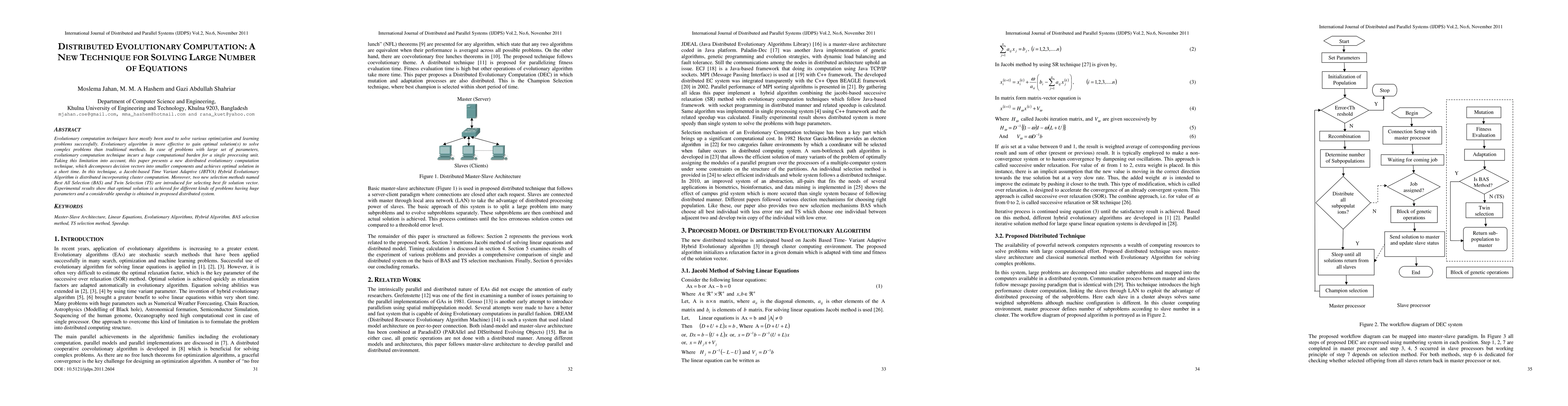 This paper introduces a distributed evolutionary computation technique to efficiently solve large-parameter problems by decomposing decision vectors and employing a Jacobi-based Time Variant Adaptive Hybrid Evolutionary Algorithm with cluster computation. Experimental results demonstrate significant speedup and optimal solution attainment.