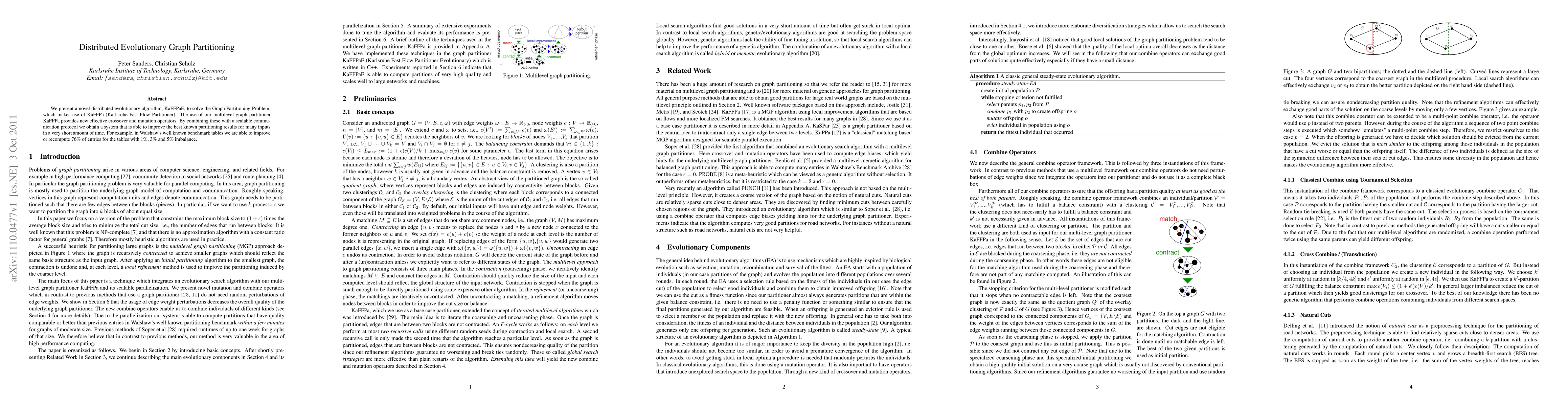 This paper introduces KaFFPaE, a distributed evolutionary algorithm that leverages the multilevel graph partitioner KaFFPa to solve the Graph Partitioning Problem. The algorithm achieves superior partitioning results by combining effective crossover and mutation operators with a scalable communication protocol, improving 76% of entries in Walshaw's benchmark tables.