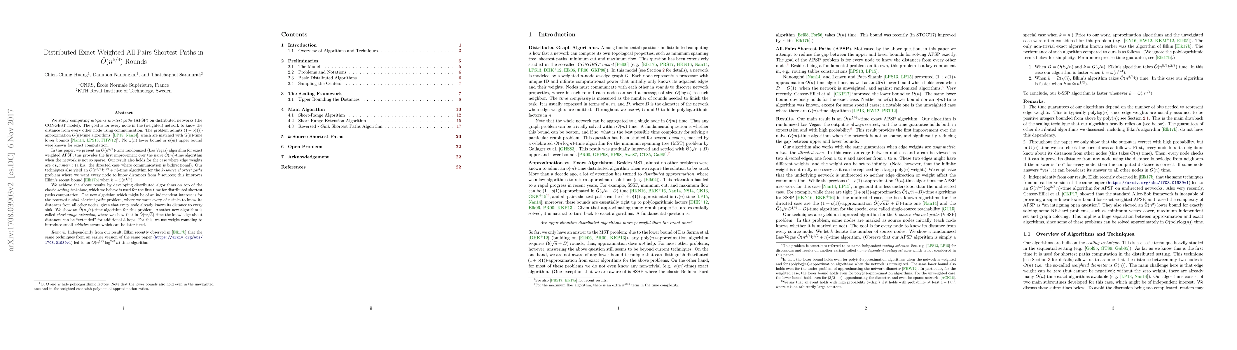 We study computing {\em all-pairs shortest paths} (APSP) on distributed networks (the CONGEST model). The goal is for every node in the (weighted) network to know the distance from every other node using communication. The problem admits $(1+o(1))$-approximation $\tilde O(n)$-time algorithms ~\cite{LenzenP-podc15,Nanongkai-STOC14}, which are matched with $\tilde \Omega(n)$-time lower bounds~\cite{Nanongkai-STOC14,LenzenP_stoc13,FrischknechtHW12}\footnote{$\tilde \Theta$, $\tilde O$ and $\tilde \Omega$ hide polylogarithmic factors. Note that the lower bounds also hold even in the unweighted case and in the weighted case with polynomial approximation ratios.}. No $\omega(n)$ lower bound or $o(m)$ upper bound were known for exact computation. In this paper, we present an $\tilde O(n^{5/4})$-time randomized (Las Vegas) algorithm for exact weighted APSP; this provides the first improvement over the naive $O(m)$-time algorithm when the network is not so sparse. Our result also holds for the case where edge weights are {\em asymmetric} (a.k.a. the directed case where communication is bidirectional). Our techniques also yield an $\tilde O(n^{3/4}k^{1/2}+n)$-time algorithm for the {\em $k$-source shortest paths} problem where we want every node to know distances from $k$ sources; this improves Elkin's recent bound~\cite{Elkin-STOC17} when $k=\tilde \omega(n^{1/4})$.