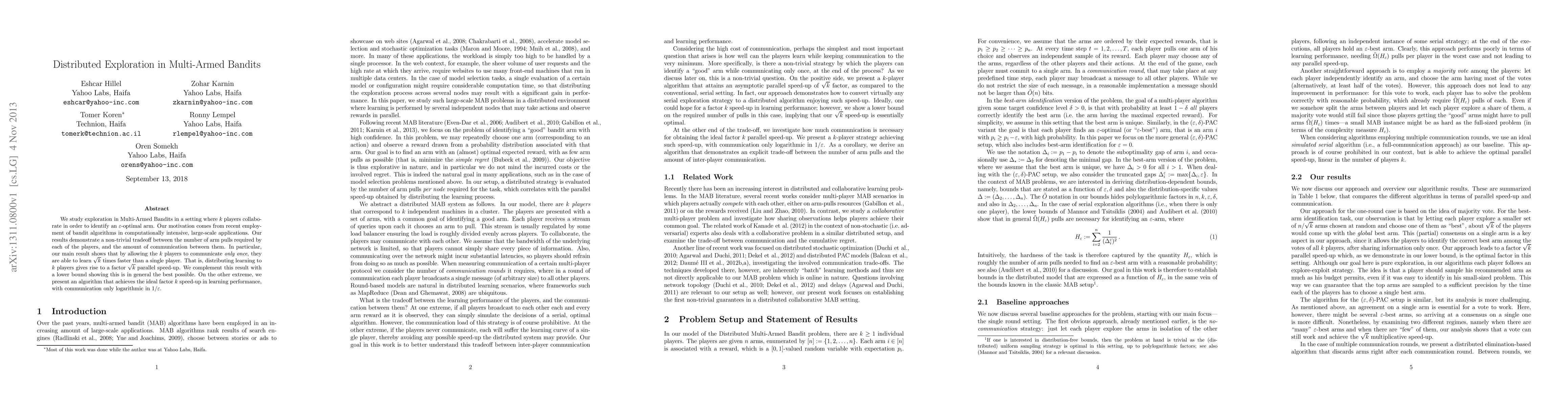 We study exploration in Multi-Armed Bandits in a setting where $k$ players collaborate in order to identify an $\epsilon$-optimal arm. Our motivation comes from recent employment of bandit algorithms in computationally intensive, large-scale applications. Our results demonstrate a non-trivial tradeoff between the number of arm pulls required by each of the players, and the amount of communication between them. In particular, our main result shows that by allowing the $k$ players to communicate only once, they are able to learn $\sqrt{k}$ times faster than a single player. That is, distributing learning to $k$ players gives rise to a factor $\sqrt{k}$ parallel speed-up. We complement this result with a lower bound showing this is in general the best possible. On the other extreme, we present an algorithm that achieves the ideal factor $k$ speed-up in learning performance, with communication only logarithmic in $1/\epsilon$.