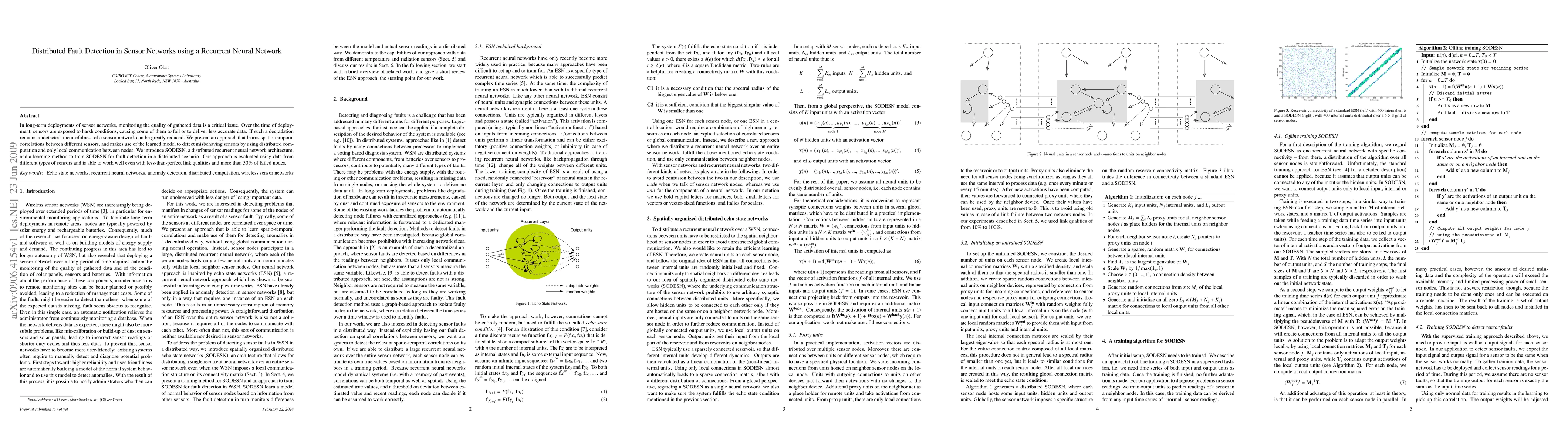 In long-term deployments of sensor networks, monitoring the quality of gathered data is a critical issue. Over the time of deployment, sensors are exposed to harsh conditions, causing some of them to fail or to deliver less accurate data. If such a degradation remains undetected, the usefulness of a sensor network can be greatly reduced. We present an approach that learns spatio-temporal correlations between different sensors, and makes use of the learned model to detect misbehaving sensors by using distributed computation and only local communication between nodes. We introduce SODESN, a distributed recurrent neural network architecture, and a learning method to train SODESN for fault detection in a distributed scenario. Our approach is evaluated using data from different types of sensors and is able to work well even with less-than-perfect link qualities and more than 50% of failed nodes.