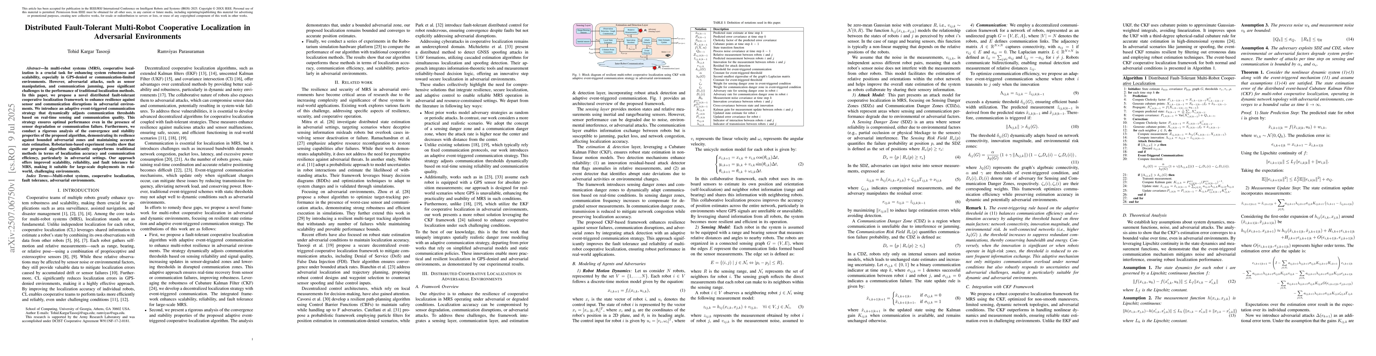 In multi-robot systems (MRS), cooperative localization is a crucial task for enhancing system robustness and scalability, especially in GPS-denied or communication-limited environments. However, adversarial attacks, such as sensor manipulation, and communication jamming, pose significant challenges to the performance of traditional localization methods. In this paper, we propose a novel distributed fault-tolerant cooperative localization framework to enhance resilience against sensor and communication disruptions in adversarial environments. We introduce an adaptive event-triggered communication strategy that dynamically adjusts communication thresholds based on real-time sensing and communication quality. This strategy ensures optimal performance even in the presence of sensor degradation or communication failure. Furthermore, we conduct a rigorous analysis of the convergence and stability properties of the proposed algorithm, demonstrating its resilience against bounded adversarial zones and maintaining accurate state estimation. Robotarium-based experiment results show that our proposed algorithm significantly outperforms traditional methods in terms of localization accuracy and communication efficiency, particularly in adversarial settings. Our approach offers improved scalability, reliability, and fault tolerance for MRS, making it suitable for large-scale deployments in real-world, challenging environments.