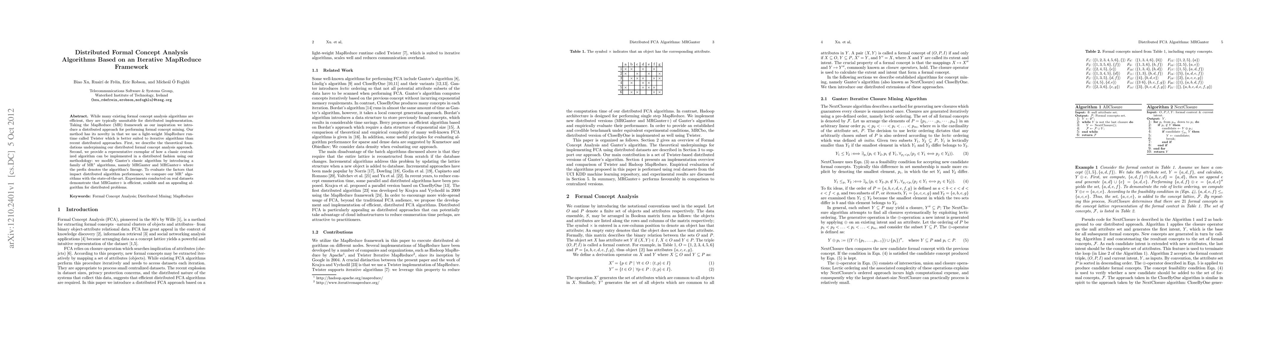 This paper proposes a distributed approach for formal concept analysis using the MapReduce framework with Twister, introducing MRGanter and MRGanter+ algorithms. Experimental results show that MRGanter+ is efficient and scalable for large datasets, outperforming state-of-the-art methods.