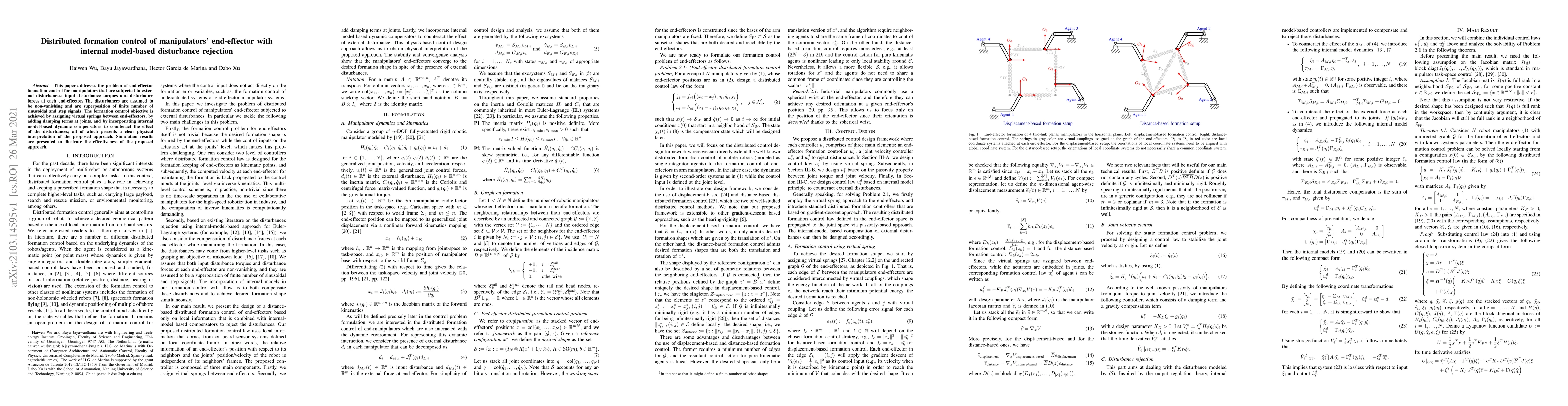 This paper proposes a method for controlling the formation of manipulators' end-effectors under external disturbances, using virtual springs, damping, and internal model-based compensators. Simulation results demonstrate the effectiveness of the approach.