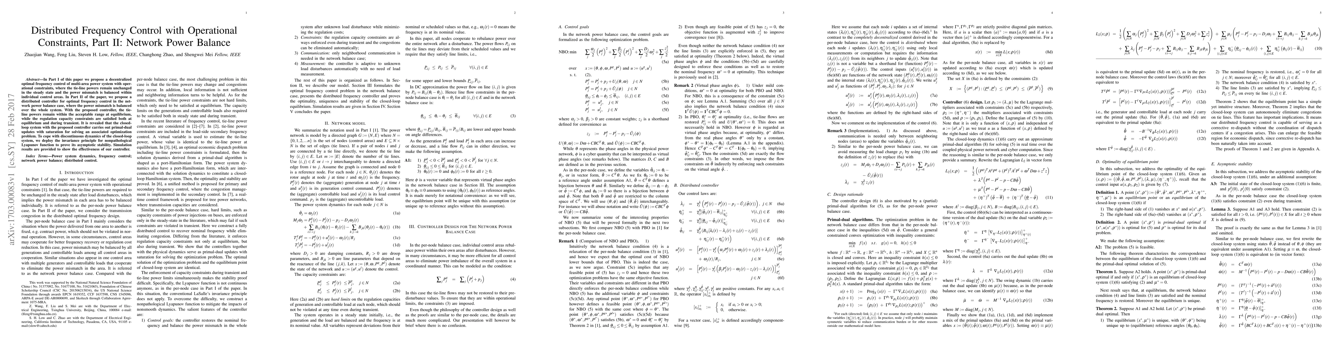 In Part I of this paper we propose a decentralized optimal frequency control of multi-area power system with operational constraints, where the tie-line powers remain unchanged in the steady state and the power mismatch is balanced within individual control areas. In Part II of the paper, we propose a distributed controller for optimal frequency control in the network power balance case, where the power mismatch is balanced over the whole system. With the proposed controller, the tie-line powers remain within the acceptable range at equilibrium, while the regulation capacity constraints are satisfied both at equilibrium and during transient. It is revealed that the closed-loop system with the proposed controller carries out primal-dual updates with saturation for solving an associated optimization problem. To cope with discontinuous dynamics of the closed-loop system, we deploy the invariance principle for nonpathological Lyapunov function to prove its asymptotic stability. Simulation results are provided to show the effectiveness of our controller.