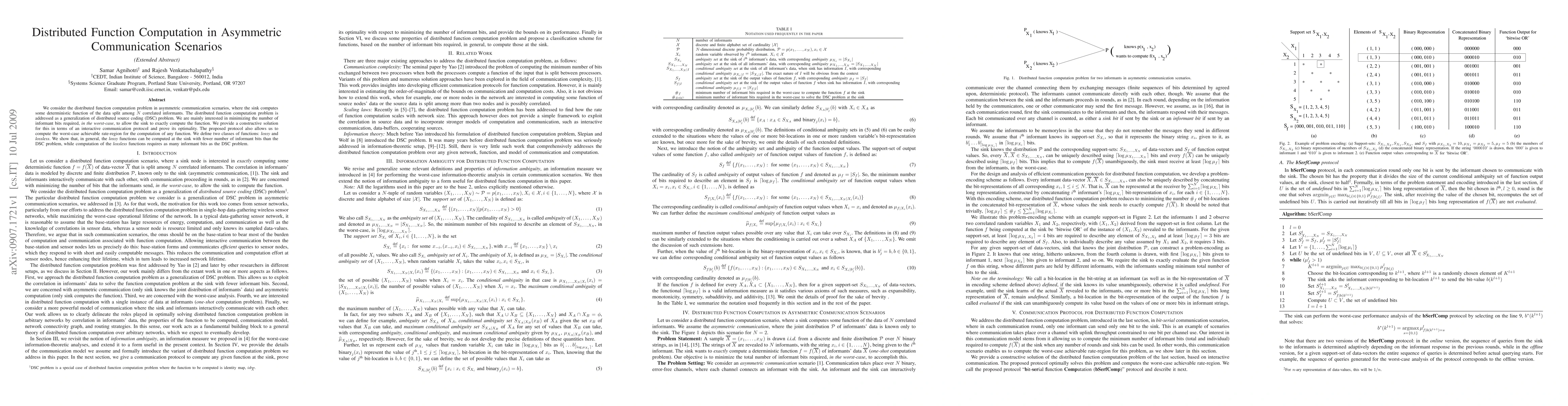 We consider the distributed function computation problem in asymmetric communication scenarios, where the sink computes some deterministic function of the data split among N correlated informants. The distributed function computation problem is addressed as a generalization of distributed source coding (DSC) problem. We are mainly interested in minimizing the number of informant bits required, in the worst-case, to allow the sink to exactly compute the function. We provide a constructive solution for this in terms of an interactive communication protocol and prove its optimality. The proposed protocol also allows us to compute the worst-case achievable rate-region for the computation of any function. We define two classes of functions: lossy and lossless. We show that, in general, the lossy functions can be computed at the sink with fewer number of informant bits than the DSC problem, while computation of the lossless functions requires as many informant bits as the DSC problem.