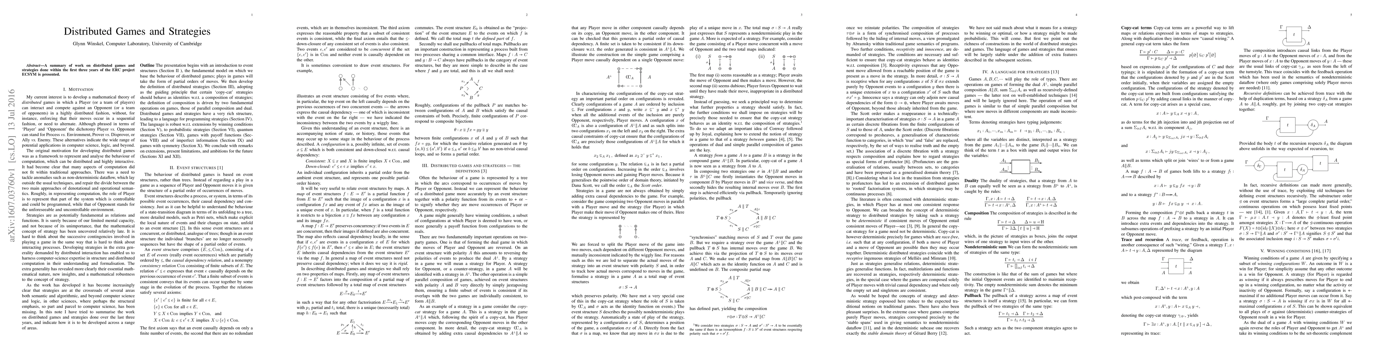 A summary of work on distributed games and strategies done within the first three years of the ERC project ECSYM is presented.