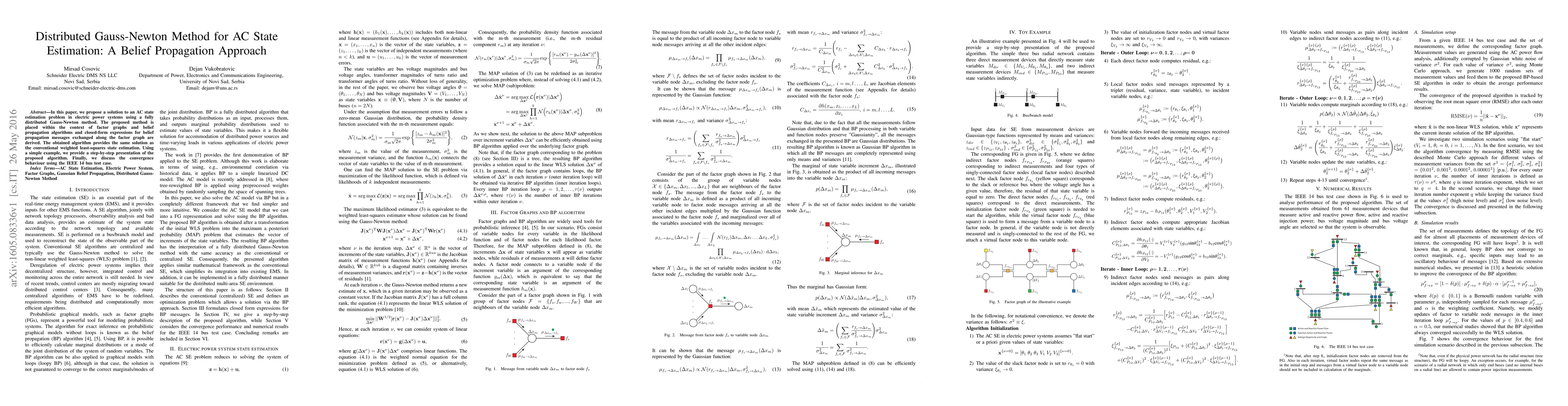 In this paper, we propose a solution to an AC state estimation problem in electric power systems using a fully distributed Gauss-Newton method. The proposed method is placed within the context of factor graphs and belief propagation algorithms and closed-form expressions for belief propagation messages exchanged along the factor graph are derived. The obtained algorithm provides the same solution as the conventional weighted least-squares state estimation. Using a simple example, we provide a step-by-step presentation of the proposed algorithm. Finally, we discuss the convergence behaviour using the IEEE 14 bus test case.