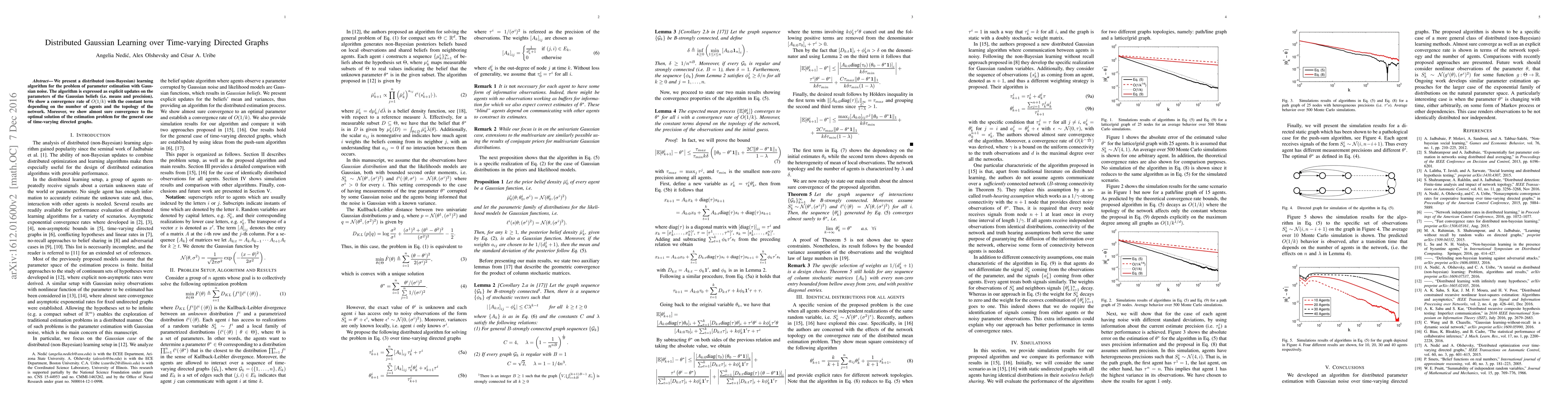 This paper introduces a distributed learning algorithm for parameter estimation under Gaussian noise, demonstrating convergence to the optimal solution with a rate of $O(1/k)$, and proving almost sure convergence for time-varying directed graphs. The algorithm updates Gaussian beliefs explicitly based on network topology and agent count.