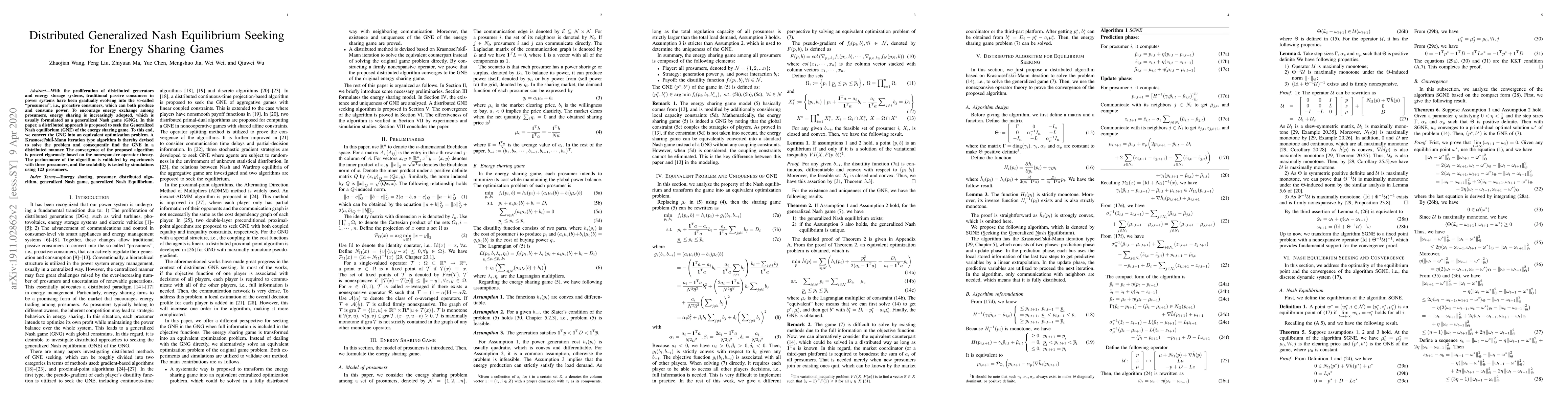 This paper proposes a distributed algorithm to find the Generalized Nash Equilibrium for energy sharing games among prosumers in power systems. It converts the game into an optimization problem and uses a Krasnosel'ski{\v{i}}-Mann iteration algorithm to solve it, proving convergence based on nonexpansive operator theory. Experiments and simulations demonstrate the algorithm's performance and scalability.