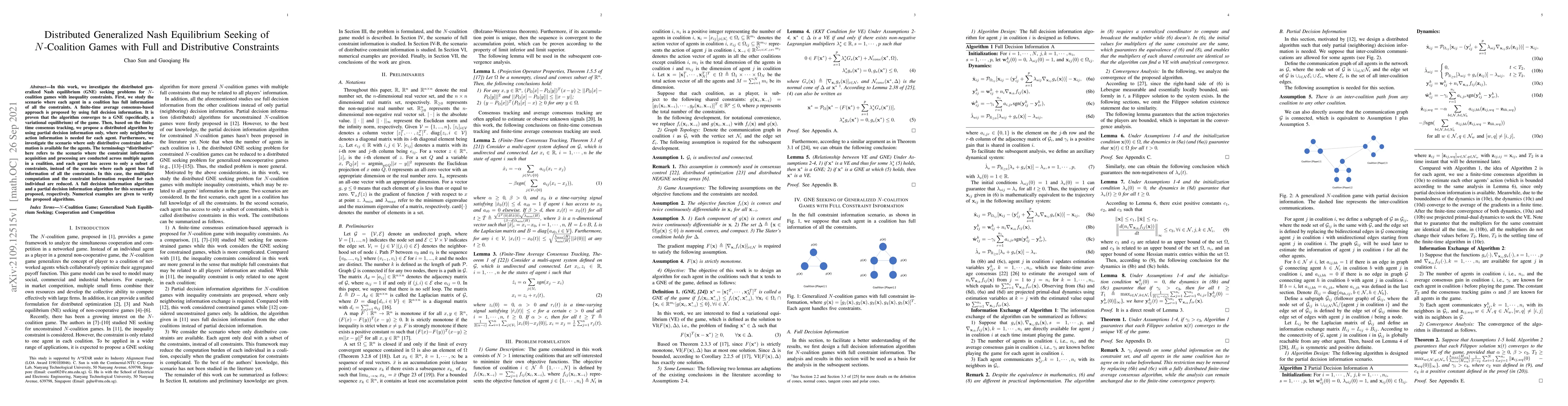 This paper explores distributed algorithms for finding generalized Nash equilibrium in $N$-coalition games with inequality constraints. It proposes finite-time consensus-based methods for full and distributive constraint scenarios, demonstrating convergence to variational equilibrium and reduced computational burden in the latter.