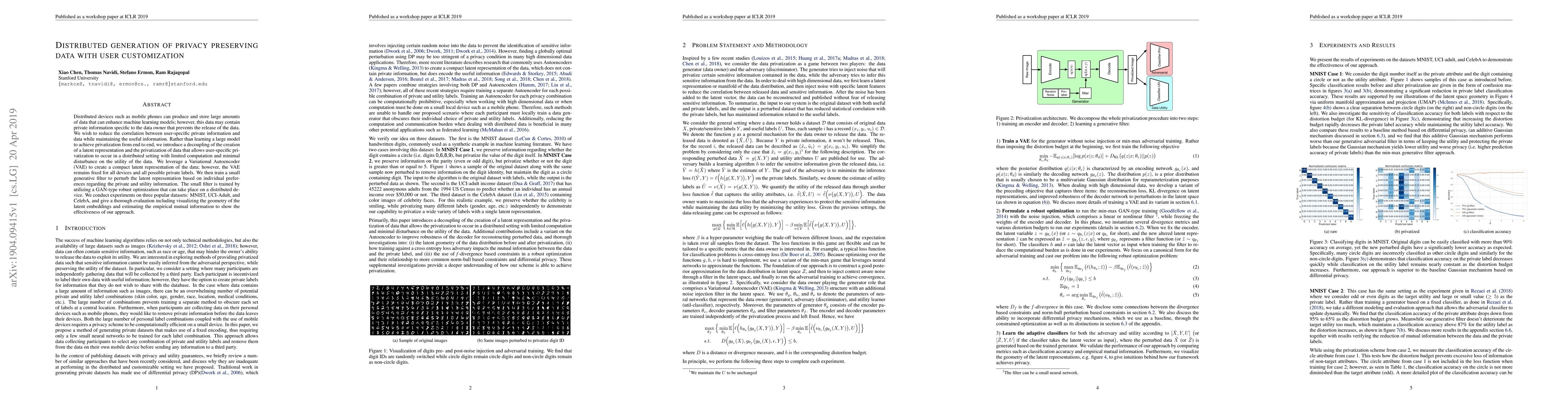 This paper proposes a method to generate privacy-preserving data while maintaining useful information from user-specific private data, using a Variational Autoencoder and generative filter trained on distributed devices.