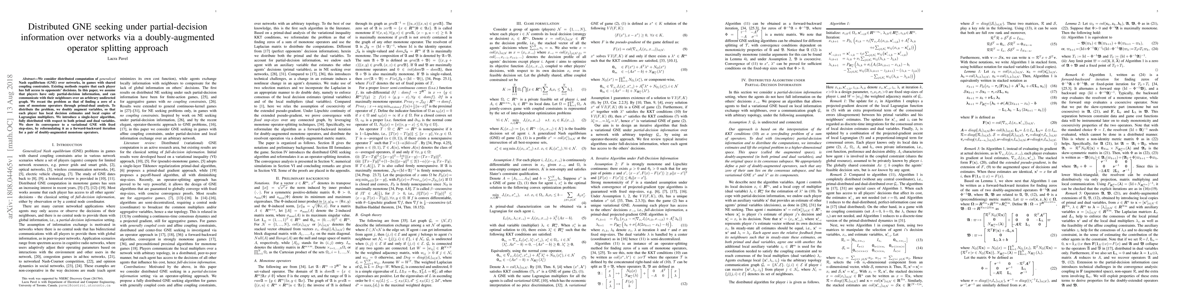 We consider distributed computation of generalized Nash equilibrium (GNE) over networks, in games with shared coupling constraints. Existing methods require that each player has full access to opponents' decisions. In this paper, we assume that players have only partial-decision information, and can communicate with their neighbours over an arbitrary undirected graph. We recast the problem as that of finding a zero of a sum of monotone operators through primal-dual analysis. To distribute the problem, we doubly augment variables, so that each player has local decision estimates and local copies of Lagrangian multipliers. We introduce a single-layer algorithm, fully distributed with respect to both primal and dual variables. We show its convergence to a variational GNE with fixed step-sizes, by reformulating it as a forward-backward iteration for a pair of doubly-augmented monotone operators.