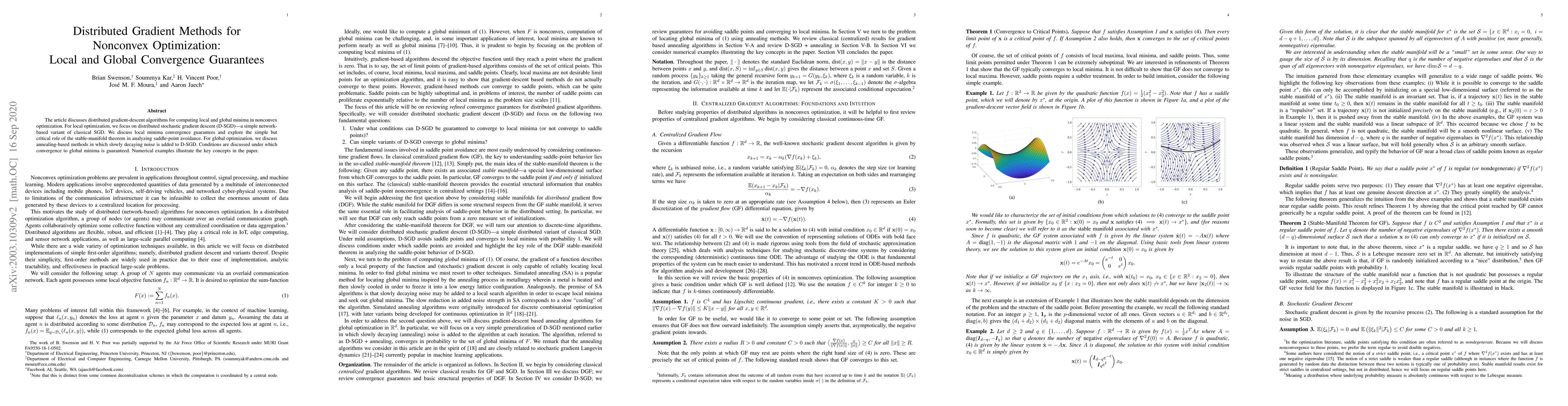 This paper explores distributed gradient-descent algorithms for nonconvex optimization, focusing on local convergence via distributed stochastic gradient descent (D-SGD) and global convergence through annealing-based methods with slowly decaying noise. The stable-manifold theorem is crucial for analyzing saddle-point avoidance and ensuring global minima convergence.