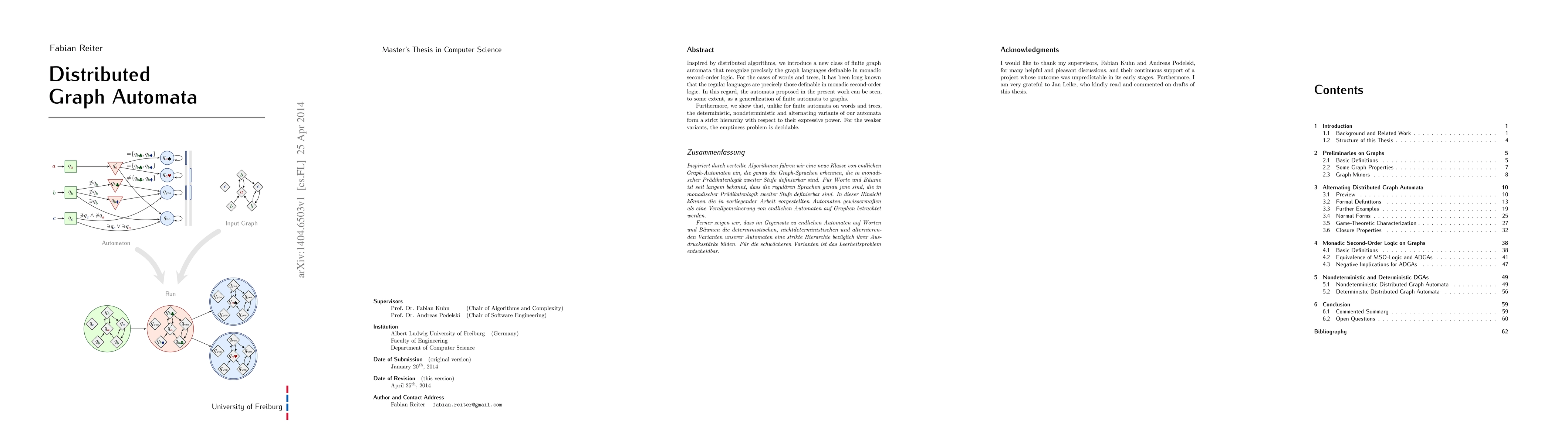 The paper introduces a new class of distributed graph automata that recognize graph languages defined in monadic second-order logic, extending the concept of finite automata to graphs. It establishes a strict hierarchy among deterministic, nondeterministic, and alternating variants of these automata, with decidable emptiness problems for the weaker variants.