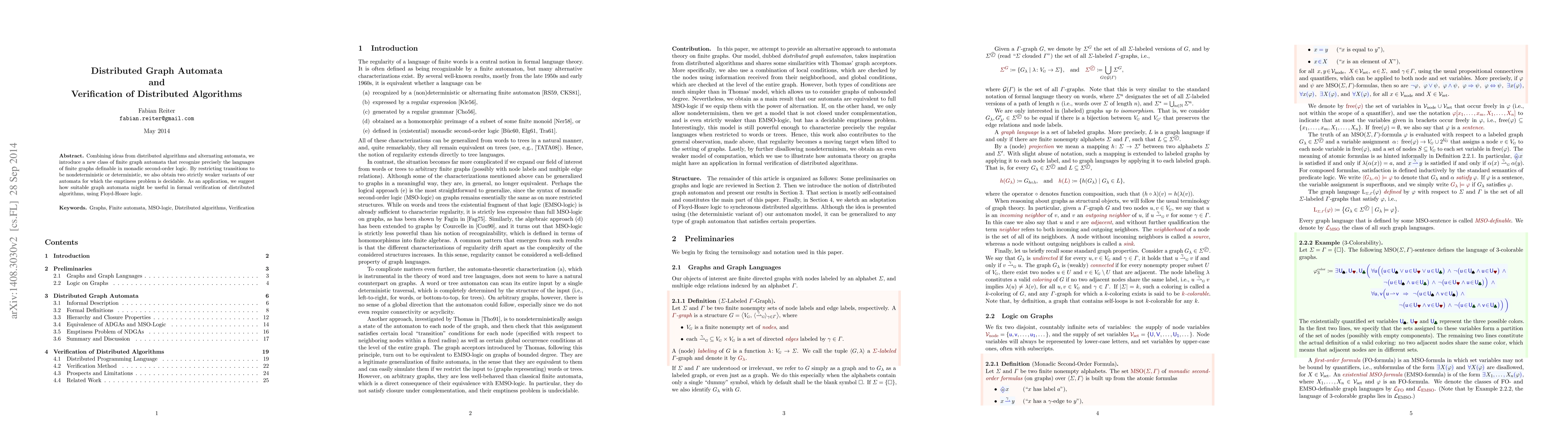 This paper introduces a new class of distributed graph automata that recognize languages of finite graphs defined in monadic second-order logic, and proposes two weaker variants for decidable emptiness problems. It suggests potential applications in formal verification of distributed algorithms using Floyd-Hoare logic.