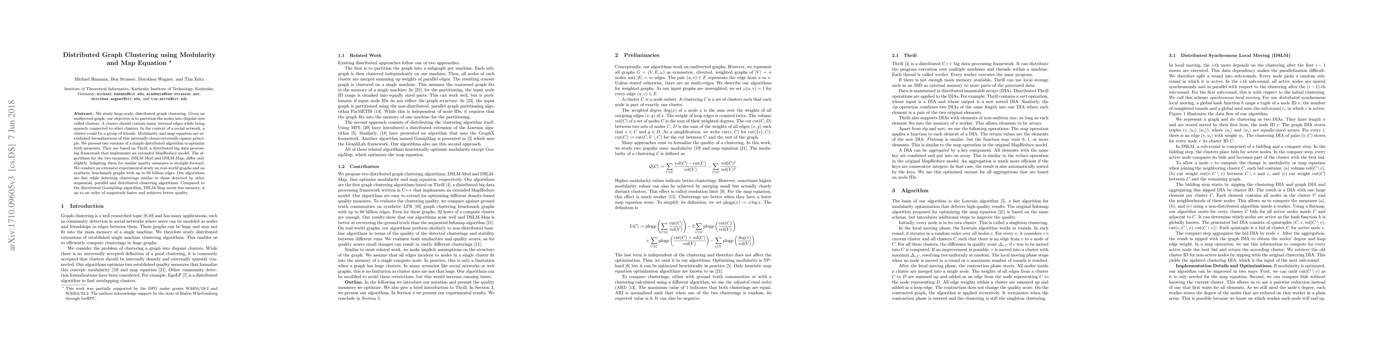 We study large-scale, distributed graph clustering. Given an undirected graph, our objective is to partition the nodes into disjoint sets called clusters. A cluster should contain many internal edges while being sparsely connected to other clusters. In the context of a social network, a cluster could be a group of friends. Modularity and map equation are established formalizations of this internally-dense-externally-sparse principle. We present two versions of a simple distributed algorithm to optimize both measures. They are based on Thrill, a distributed big data processing framework that implements an extended MapReduce model. The algorithms for the two measures, DSLM-Mod and DSLM-Map, differ only slightly. Adapting them for similar quality measures is straight-forward. We conduct an extensive experimental study on real-world graphs and on synthetic benchmark graphs with up to 68 billion edges. Our algorithms are fast while detecting clusterings similar to those detected by other sequential, parallel and distributed clustering algorithms. Compared to the distributed GossipMap algorithm, DSLM-Map needs less memory, is up to an order of magnitude faster and achieves better quality.