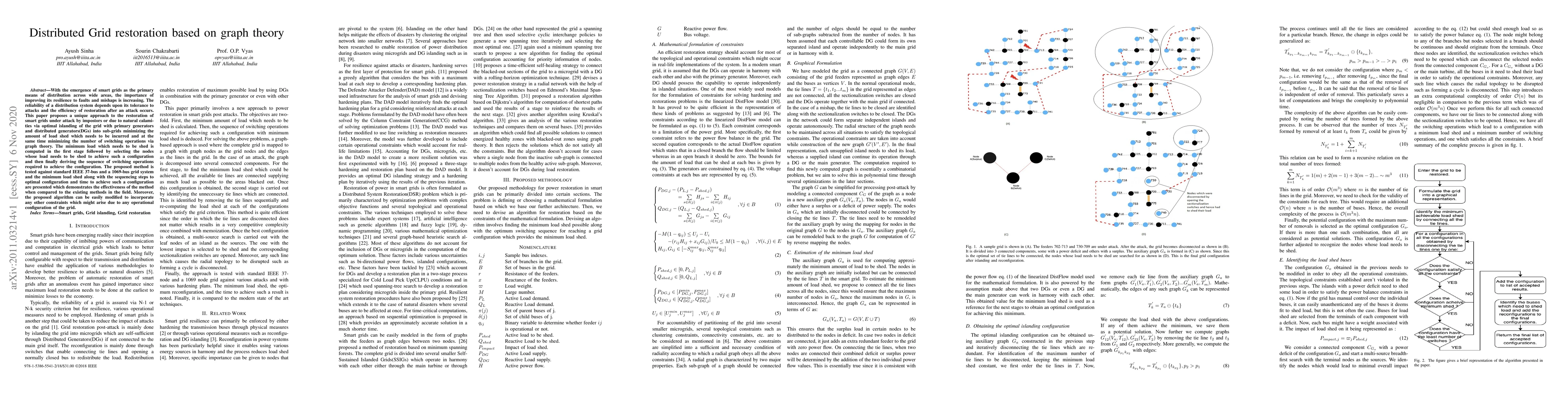 With the emergence of smart grids as the primary means of distribution across wide areas, the importance of improving its resilience to faults and mishaps is increasing. The reliability of a distribution system depends upon its tolerance to attacks and the efficiency of restoration after an attack occurs. This paper proposes a unique approach to the restoration of smart grids under attack by impostors or due to natural calamities via optimal islanding of the grid with primary generators and distributed generators(DGs) into sub-grids minimizing the amount of load shed which needs to be incurred and at the same time minimizing the number of switching operations via graph theory. The minimum load which needs to be shed is computed in the first stage followed by selecting the nodes whose load needs to be shed to achieve such a configuration and then finally deriving the sequence of switching operations required to achieve the configuration. The proposed method is tested against standard IEEE 37-bus and a 1069-bus grid system and the minimum load shed along with the sequencing steps to optimal configuration and time to achieve such a configuration are presented which demonstrates the effectiveness of the method when compared to the existing methods in the field. Moreover, the proposed algorithm can be easily modified to incorporate any other constraints which might arise due to any operational configuration of the grid.