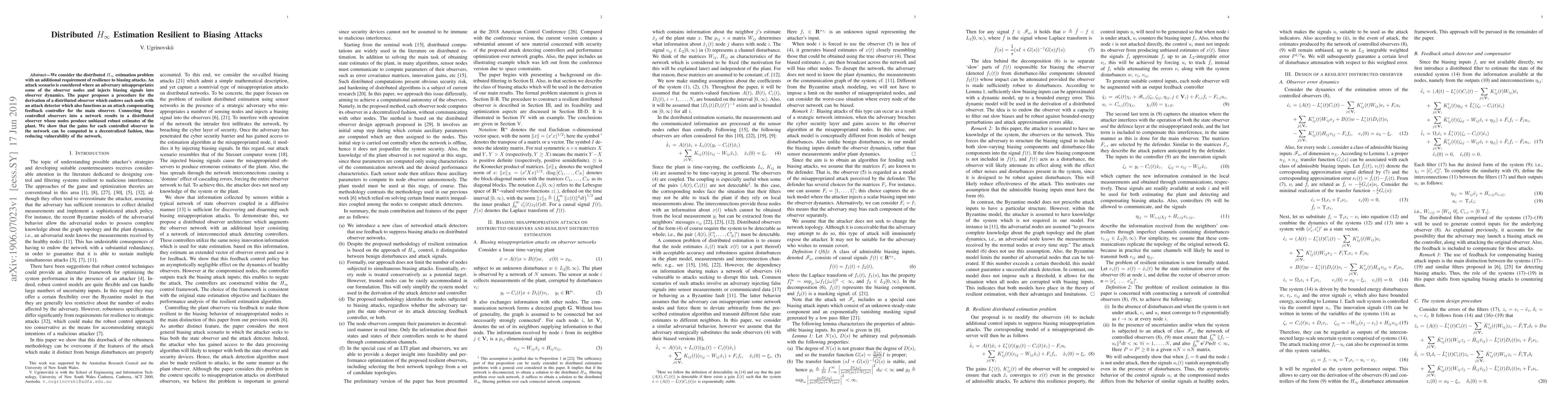 We consider the distributed $H_\infty$ estimation problem with an additional requirement of resilience to biasing attacks. An attack scenario is considered where an adversary misappropriates some of the observer nodes and injects biasing signals into observer dynamics. The paper proposes a procedure for the derivation of a distributed observer which endows each node with an attack detector which also functions as an attack compensating feedback controller for the main observer. Connecting these controlled observers into a network results in a distributed observer whose nodes produce unbiased robust estimates of the plant. We show that the gains for each controlled observer in the network can be computed in a decentralized fashion, thus reducing vulnerability of the network.