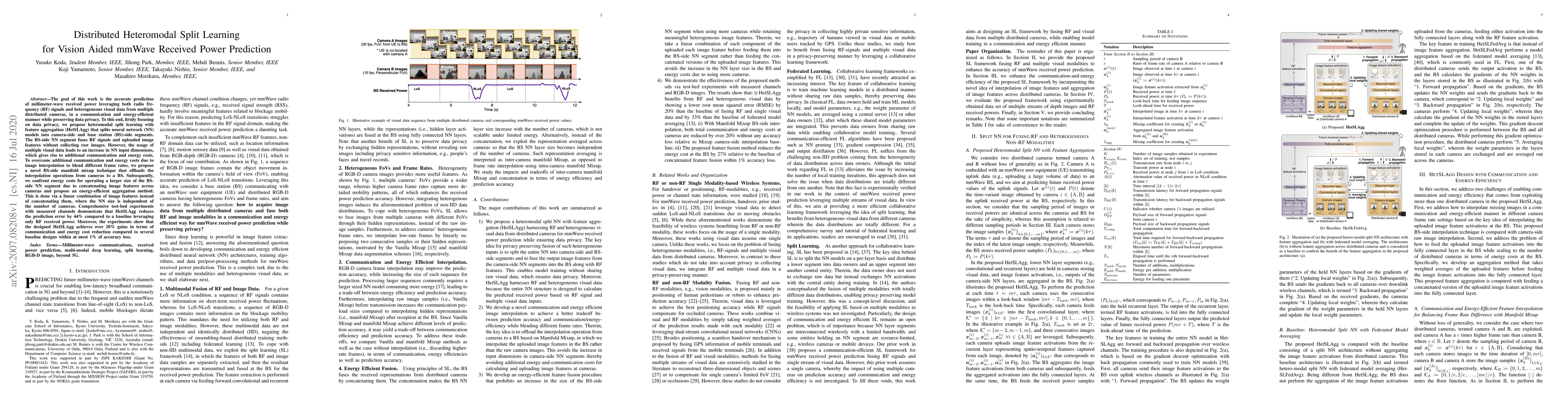 The goal of this work is the accurate prediction of millimeter-wave received power leveraging both radio frequency (RF) signals and heterogeneous visual data from multiple distributed cameras, in a communication and energy-efficient manner while preserving data privacy. To this end, firstly focusing on data privacy, we propose heteromodal split learning with feature aggregation (HetSLAgg) that splits neural network (NN) models into camera-side and base station (BS)-side segments. The BS-side NN segment fuses RF signals and uploaded image features without collecting raw images. However, the usage of multiple visual data leads to an increase in NN input dimensions, which gives rise to additional communication and energy costs. To overcome additional communication and energy costs due to image interpolation to blend different frame rates, we propose a novel BS-side manifold mixup technique that offloads the interpolation operations from cameras to a BS. Subsequently, we confront energy costs for operating a larger size of the BS- side NN segment due to concatenating image features across cameras and propose an energy-efficient aggregation method. This is done via a linear combination of image features instead of concatenating them, where the NN size is independent of the number of cameras. Comprehensive test-bed experiments with measured channels demonstrate that HetSLAgg reduces the prediction error by 44% compared to a baseline leveraging only RF received power. Moreover, the experiments show that the designed HetSLAgg achieves over 20% gains in terms of communication and energy cost reduction compared to several baseline designs within at most 1% of accuracy loss.
