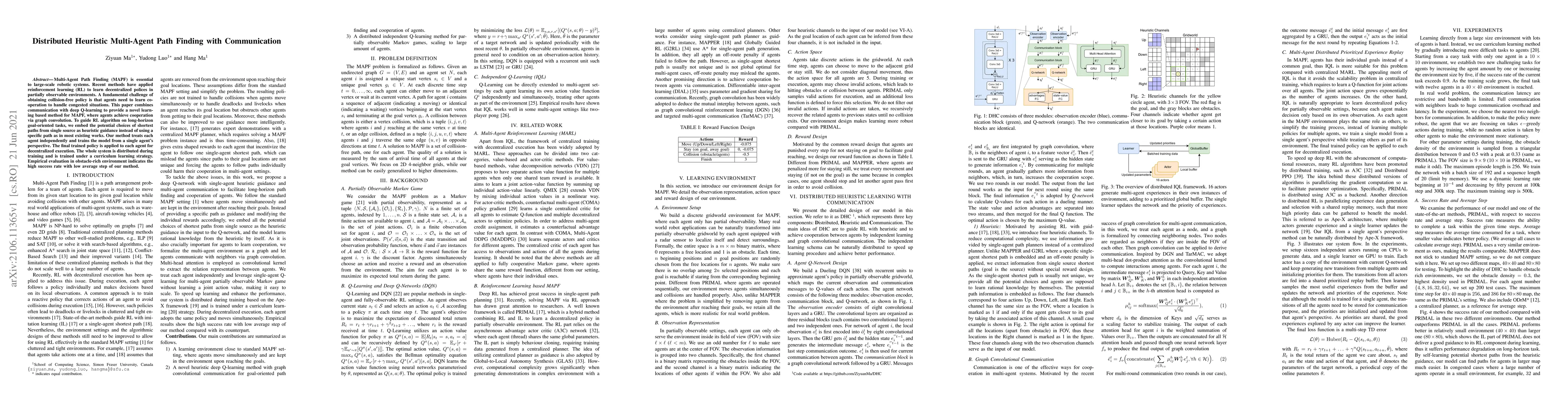 This paper proposes a distributed heuristic multi-agent path finding method using reinforcement learning and communication. It employs deep Q-learning with graph convolution for agent cooperation and heuristic guidance for long-horizon tasks, achieving high success rates and low steps in obstacle-rich environments.