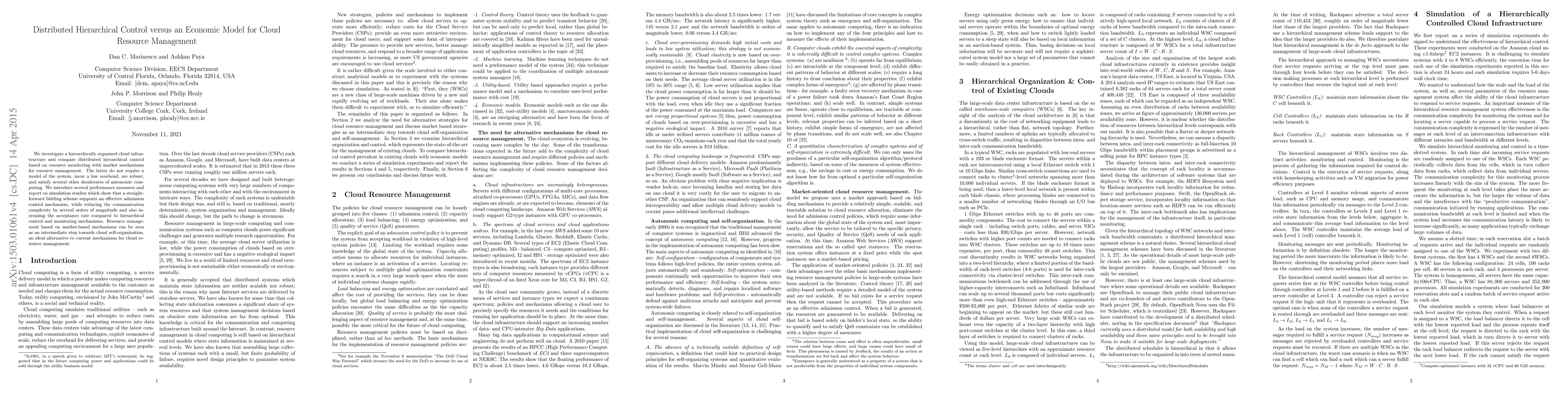 We investigate a hierarchically organized cloud infrastructure and compare distributed hierarchical control based on resource monitoring with market mechanisms for resource management. The latter do not require a model of the system, incur a low overhead, are robust, and satisfy several other desiderates of autonomic computing. We introduce several performance measures and report on simulation studies which show that a straightforward bidding scheme supports an effective admission control mechanism, while reducing the communication complexity by several orders of magnitude and also increasing the acceptance rate compared to hierarchical control and monitoring mechanisms. Resource management based on market-based mechanisms can be seen as an intermediate step towards cloud self-organization, an ideal alternative to current mechanisms for cloud resource management.