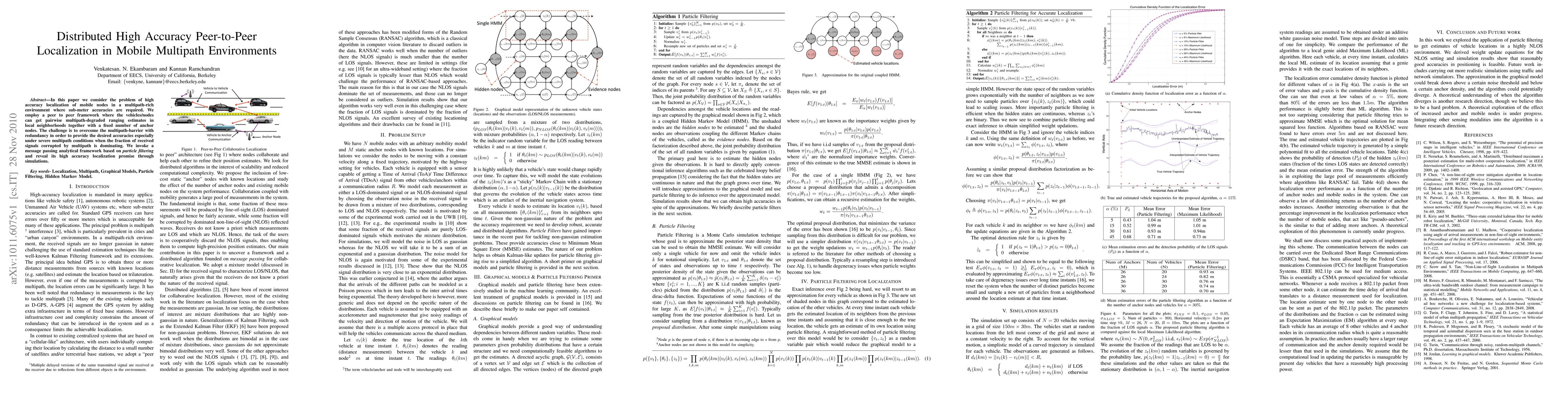 In this paper we consider the problem of high accuracy localization of mobile nodes in a multipath-rich environment where sub-meter accuracies are required. We employ a peer to peer framework where the vehicles/nodes can get pairwise multipath-degraded ranging estimates in local neighborhoods together with a fixed number of anchor nodes. The challenge is to overcome the multipath-barrier with redundancy in order to provide the desired accuracies especially under severe multipath conditions when the fraction of received signals corrupted by multipath is dominating. We invoke a message passing analytical framework based on particle filtering and reveal its high accuracy localization promise through simulations.